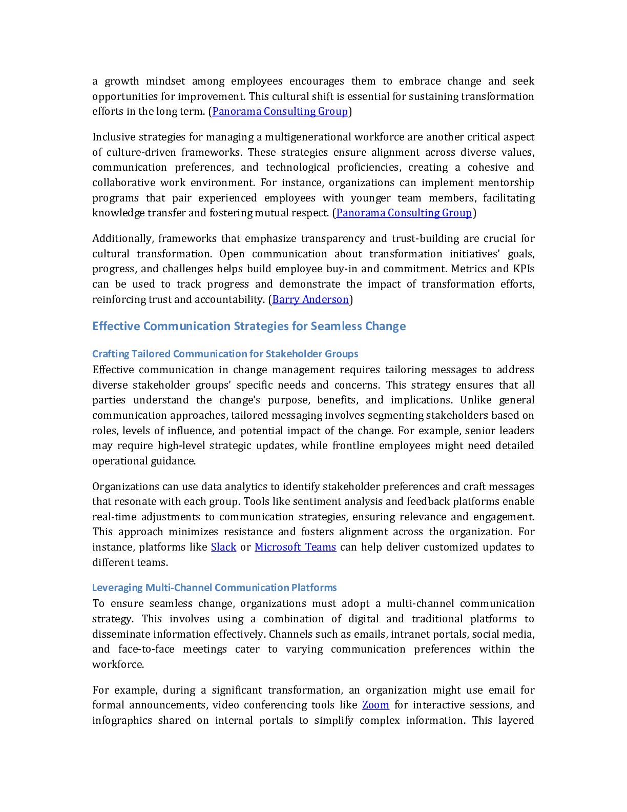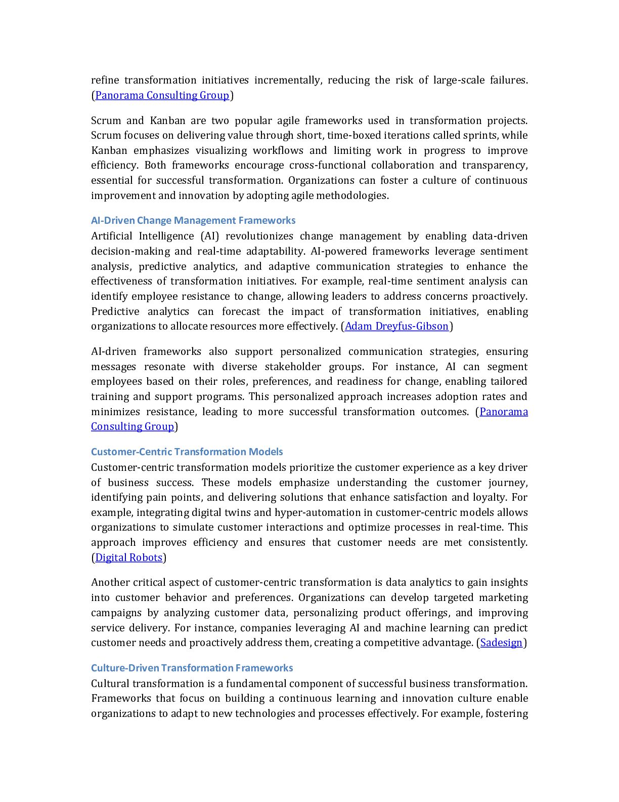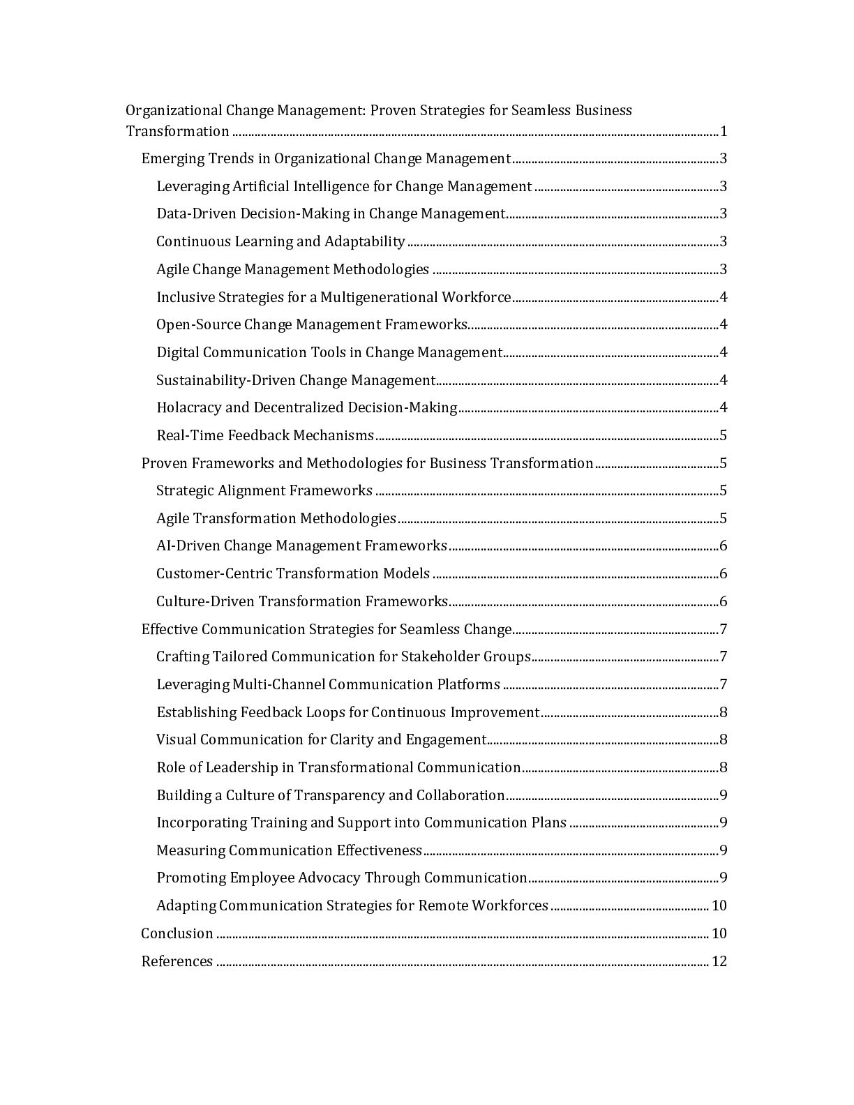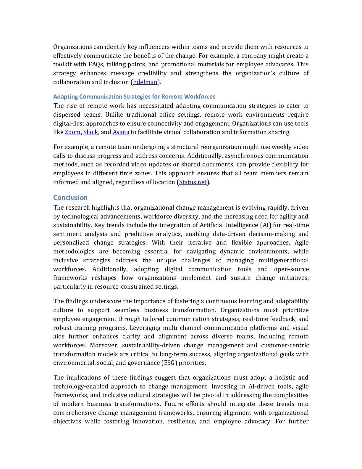 with resources to effectively communicate the benefits of the change. For example, a company might create a toolkit with FAQs, talking points, and promotional materials for employee advocates. This strategy enhances message credibility and strengthens the organization's culture of collaboration and inclusion (Edelman). Adapting Communication Strategies for Remote Workforces The rise of remote work has necessitated adapting communication strategies to cater to dispersed teams. Unlike traditional office settings, remote work environments require digital-first approaches to ensure connectivity and engagement. Organizations can use tools like Zoom, Slack, and Asana to facilitate virtual collaboration and information sharing. For example, a remote team undergoing a structural reorganization might use weekly video calls to discuss progress and address concerns. Additionally, asynchronous communication methods, such as recorded video updates or shared documents, can provide flexibility for employees in different time zones. This approach ensures that all team members remain informed and aligned, regardless of location (Status.net). Conclusion The research highlights that organizational change management is evolving rapidly, driven by technological advancements, workforce diversity, and the increasing need for agility and sustainability. Key trends include the integration of Artificial Intelligence (AI) for real-time sentiment analysis and predictive analytics, enabling data-driven decision-making and personalized change strategies. With their iterative and flexible approaches, Agile methodologies are becoming essential for navigating dynamic environments, while inclusive strategies address the unique challenges of managing multigenerational workforces. Additionally, adopting digital communication tools and open-source frameworks reshapes how organizations implement and sustain change initiatives, particularly in resource-constrained settings. The findings underscore the importance of fostering a continuous learning and adaptability culture to support seamless business transformation. Organizations must prioritize employee engagement through tailored communication strategies, real-time feedback, and robust training programs. Leveraging multi-channel communication platforms and visual aids further enhances clarity and alignment across diverse teams, including remote workforces. Moreover, sustainability-driven change management and customer-centric transformation models are critical to long-term success, aligning organizational goals with environmental, social, and governance (ESG) priorities. The implications of these findings suggest that organizations must adopt a holistic and technology-enabled approach to change management. Investing in AI-driven tools, agile frameworks, and inclusive cultural strategies will be pivotal in addressing the complexities of modern business transformations. Future efforts should integrate these trends into comprehensive change management frameworks, ensuring alignment with organizational objectives while fostering innovation, resilience, and employee advocacy. For further