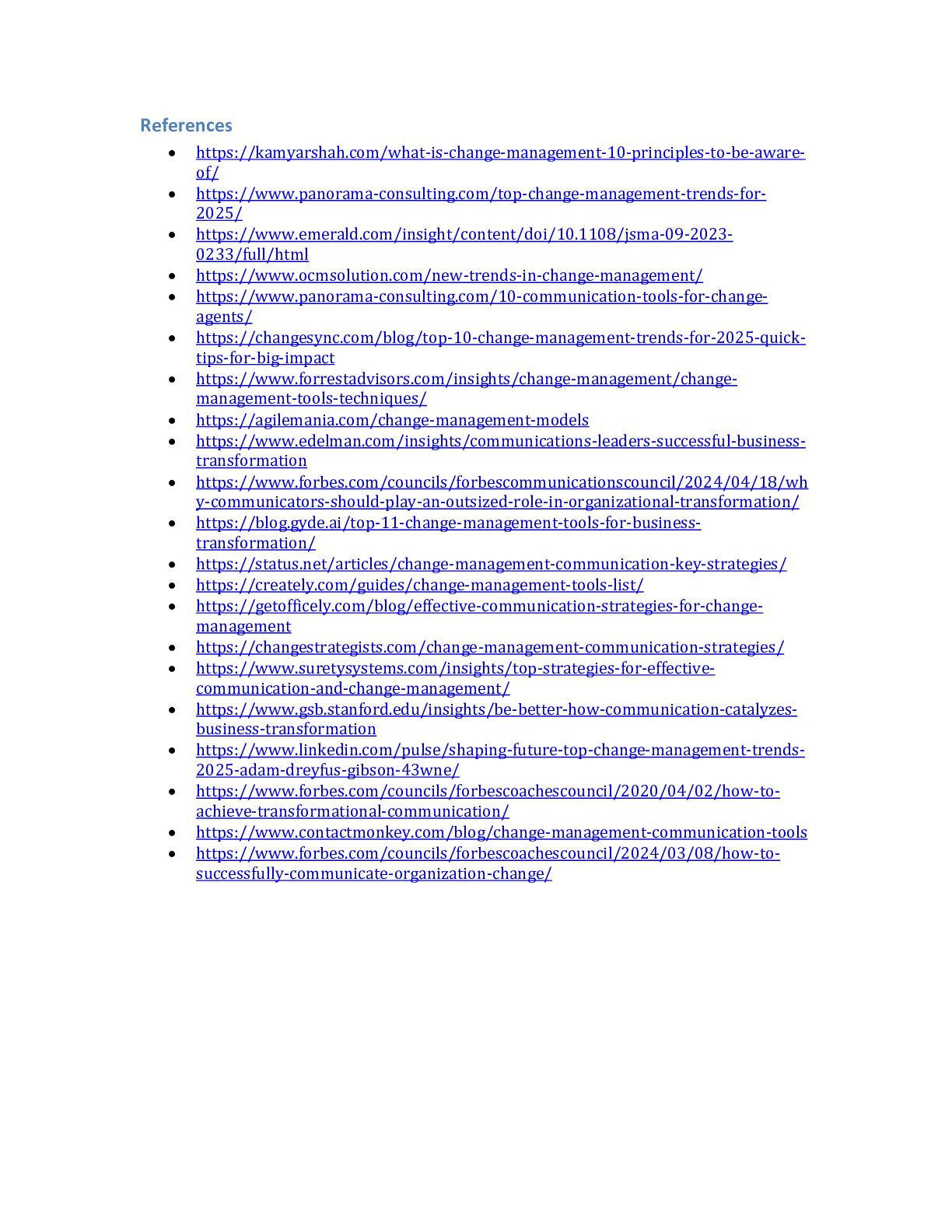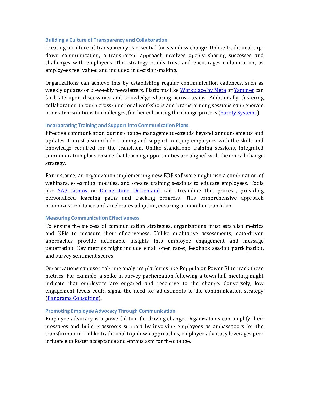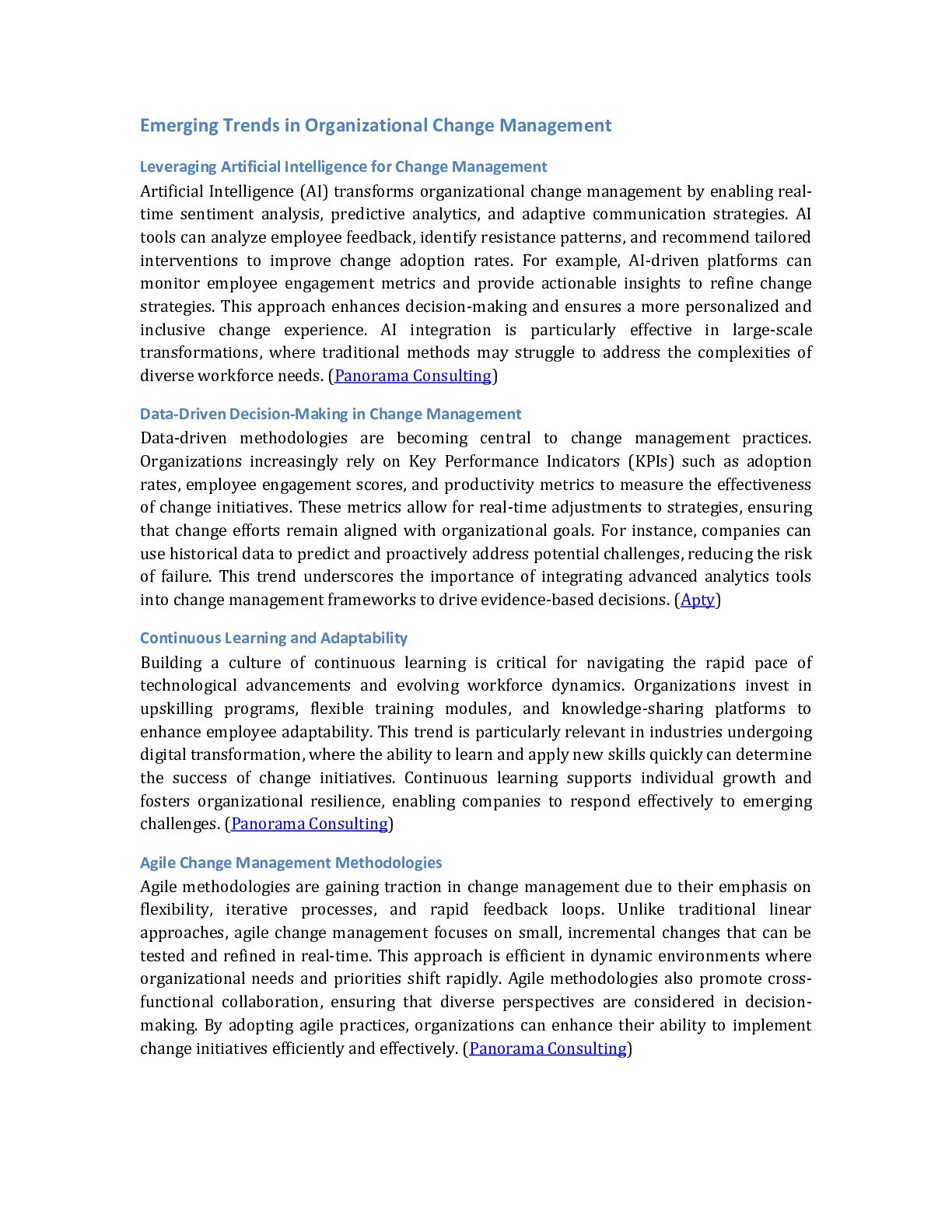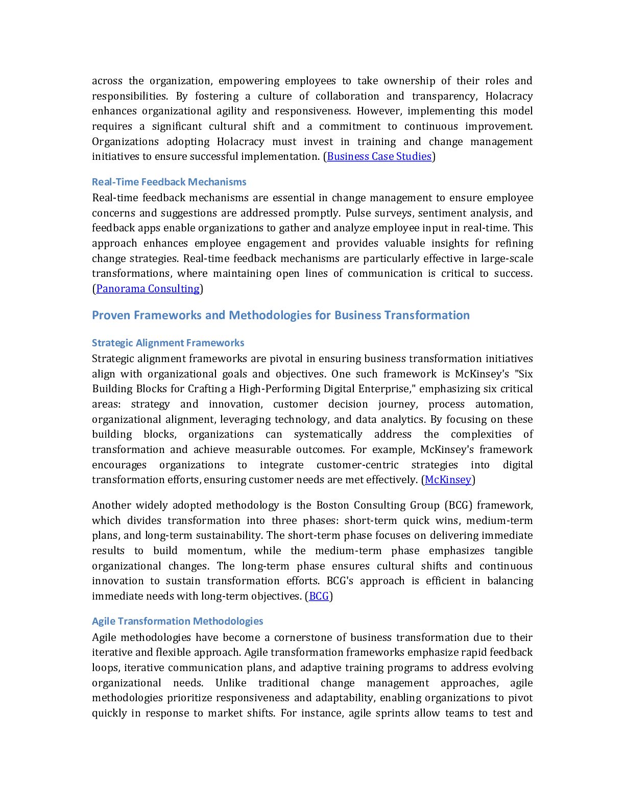 with resources to effectively communicate the benefits of the change. For example, a company might create a toolkit with FAQs, talking points, and promotional materials for employee advocates. This strategy enhances message credibility and strengthens the organization's culture of collaboration and inclusion (Edelman). Adapting Communication Strategies for Remote Workforces The rise of remote work has necessitated adapting communication strategies to cater to dispersed teams. Unlike traditional office settings, remote work environments require digital-first approaches to ensure connectivity and engagement. Organizations can use tools like Zoom, Slack, and Asana to facilitate virtual collaboration and information sharing. For example, a remote team undergoing a structural reorganization might use weekly video calls to discuss progress and address concerns. Additionally, asynchronous communication methods, such as recorded video updates or shared documents, can provide flexibility for employees in different time zones. This approach ensures that all team members remain informed and aligned, regardless of location (Status.net). Conclusion The research highlights that organizational change management is evolving rapidly, driven by technological advancements, workforce diversity, and the increasing need for agility and sustainability. Key trends include the integration of Artificial Intelligence (AI) for real-time sentiment analysis and predictive analytics, enabling data-driven decision-making and personalized change strategies. With their iterative and flexible approaches, Agile methodologies are becoming essential for navigating dynamic environments, while inclusive strategies address the unique challenges of managing multigenerational workforces. Additionally, adopting digital communication tools and open-source frameworks reshapes how organizations implement and sustain change initiatives, particularly in resource-constrained settings. The findings underscore the importance of fostering a continuous learning and adaptability culture to support seamless business transformation. Organizations must prioritize employee engagement through tailored communication strategies, real-time feedback, and robust training programs. Leveraging multi-channel communication platforms and visual aids further enhances clarity and alignment across diverse teams, including remote workforces. Moreover, sustainability-driven change management and customer-centric transformation models are critical to long-term success, aligning organizational goals with environmental, social, and governance (ESG) priorities. The implications of these findings suggest that organizations must adopt a holistic and technology-enabled approach to change management. Investing in AI-driven tools, agile frameworks, and inclusive cultural strategies will be pivotal in addressing the complexities of modern business transformations. Future efforts should integrate these trends into comprehensive change management frameworks, ensuring alignment with organizational objectives while fostering innovation, resilience, and employee advocacy. For further