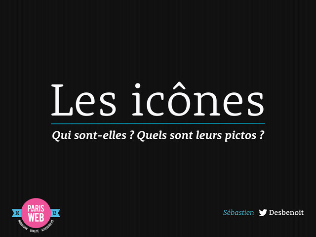 artifacts. DA Norman - 1991 > The design, understanding and usage of pictograms, Tijus, Barcenilla, Cambon de Lavale e and Meunier - 2007 > Pictograms – The New Sliced Bread in Icon Design, Jenny Gemmell - 2012 > We need a standard show navigation icon for responsive web design, Andy Clarke - 2012 Crédits > Texture de fond : Subtle Dark Vertical par Cody L. disponible sur subtlepa erns.com > Police : Rooney par Jan Fromm > Marie-Cécile Paccard, Nathalie Rosenberg pour la relecture & Thomas Zilliox pour le test dans le TGV