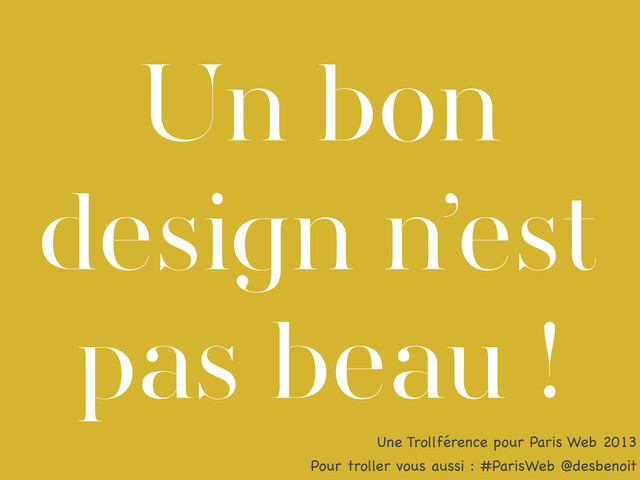 Le support de ma conférence à Paris Web, le 11 octobre 2013. Une version article est disponible à l'URL: http://blog.thinkinnovation.fr/BonDesignPasBeau