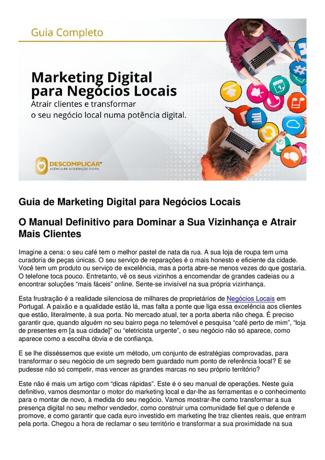 trazer resultados visíveis (mais chamadas, mais pedidos de direções) em poucas semanas. O SEO Local é uma estratégia a médio-longo prazo, podendo demorar 3 a 6 meses a ver uma subida significativa nos rankings. Anúncios pagos podem gerar tráfego e clientes imediatamente. A chave é a consistência. Devo preocupar-me em estar em diretórios locais como as Páginas Amarelas online? Sim, mas de forma estratégica. Estar nos principais diretórios locais (Páginas Amarelas, Yelp, Zomato para restaurantes, etc.) é importante para o SEO Local, principalmente para criar “citações” e reforçar a consistência do seu NAP. Não precisa de estar em centenas, mas garanta que o seu perfil nos 5-10 diretórios mais relevantes para Portugal e para o seu setor está completo e consistente. Não tenho muito tempo para gerir tudo isto. Qual deve ser a minha prioridade máxima? Se o tempo é o seu recurso mais escasso, a sua prioridade máxima deve ser o seu Google Business Profile. Dedique algumas horas a otimizá-lo completamente e depois reserve 15-20 minutos por semana para responder a novas reviews e criar um Google Post. Esta única ação terá o maior impacto no seu negócio com o menor investimento de tempo contínuo. Como é que a Descomplicar® pode ajudar especificamente o meu pequeno negócio local? A Descomplicar® ajuda Negócios Locais a implementar uma estratégia digital completa e sem complicações. Nós tratamos da otimização técnica do seu SEO e Google Business Profile, gerimos campanhas de anúncios locais de alto retorno, e ajudamo-lo a criar conteúdo que ressoa com a sua comunidade. O nosso objetivo é libertá-lo para se focar naquilo que faz melhor: gerir o seu negócio, enquanto nós garantimos que os clientes continuam a entrar pela porta.