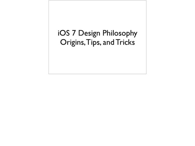My slides introducing the new design philosophy in iOS 7 to the CocoaHeads group. Note that this presentation was given before the iOS 7 NDA was lifted, so there's some stuff I'm sort of willfully obtuse about.