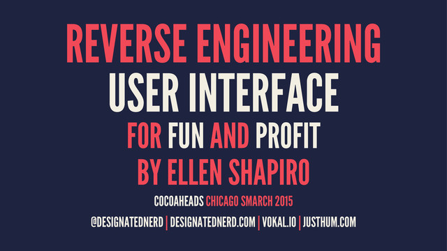 This edition contains a few minor updates in here from my talk in Boston (available here: https://speakerdeck.com/designatednerd/reverse-engineering-ui-for-fun-and-profit-cocoaconf-boston-november-2014) including better links at the end, and mostly just cosmetic updates from the version of this talk I gave in Atlanta (https://speakerdeck.com/designatednerd/reverse-engineering-ui-for-fun-and-profit-cocoaconf-atlanta-december-2014)
