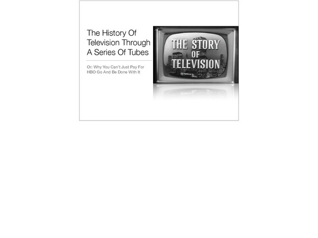 This? • My father is George Shapiro, a cable lawyer from 1964-1999, and a member of the National Cable and Telecommunications Association’s Cable TV Pioneers. • I worked in television production in LA for 7 years before I rage-quit to become a software engineer. • I still watch a metric fuckton of television. Dad’s oral history (and he rambles worse than I do): http://www.cablecenter.org/barco-library-hauser-oral-history/item/shapiro-george.html