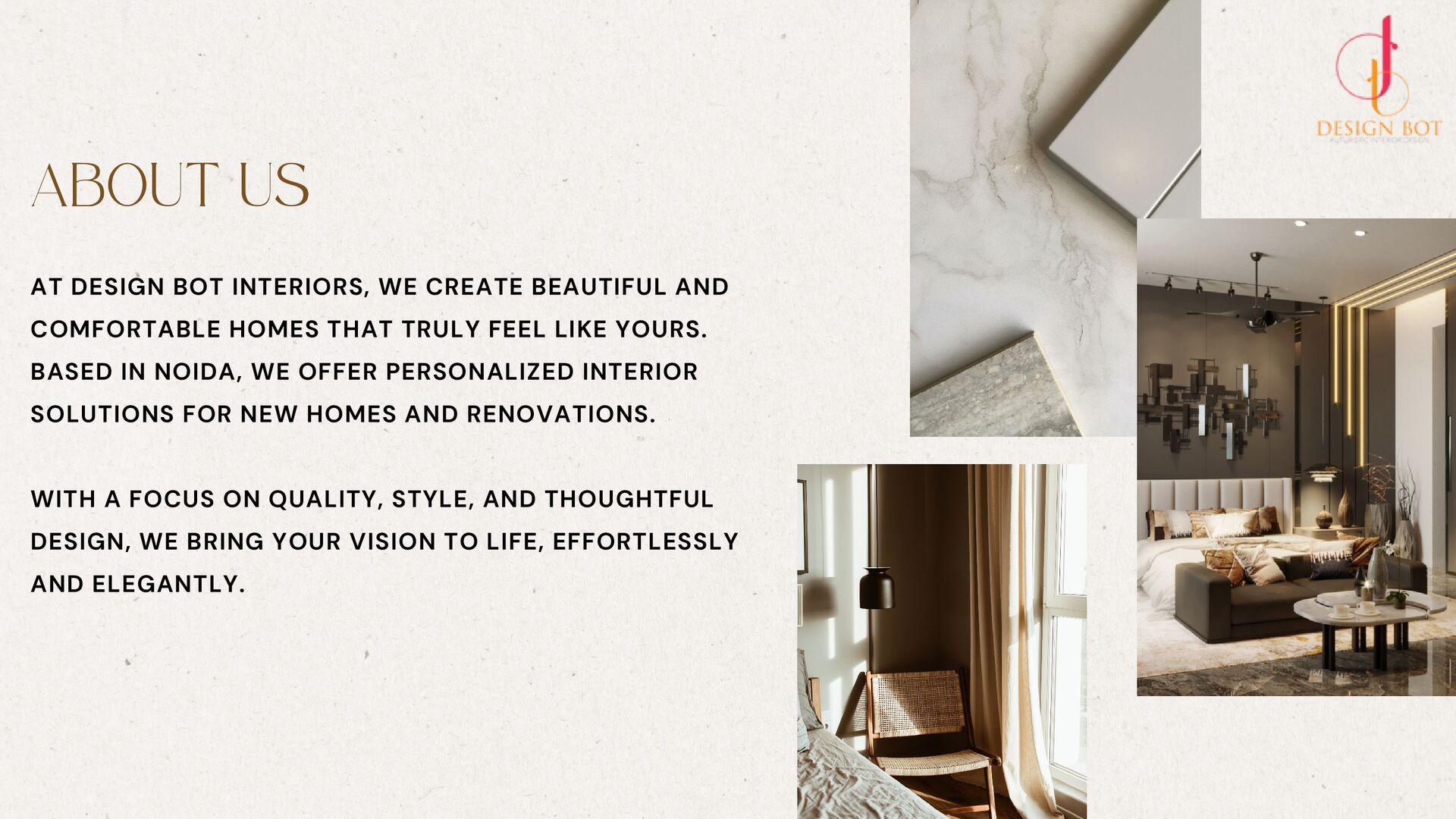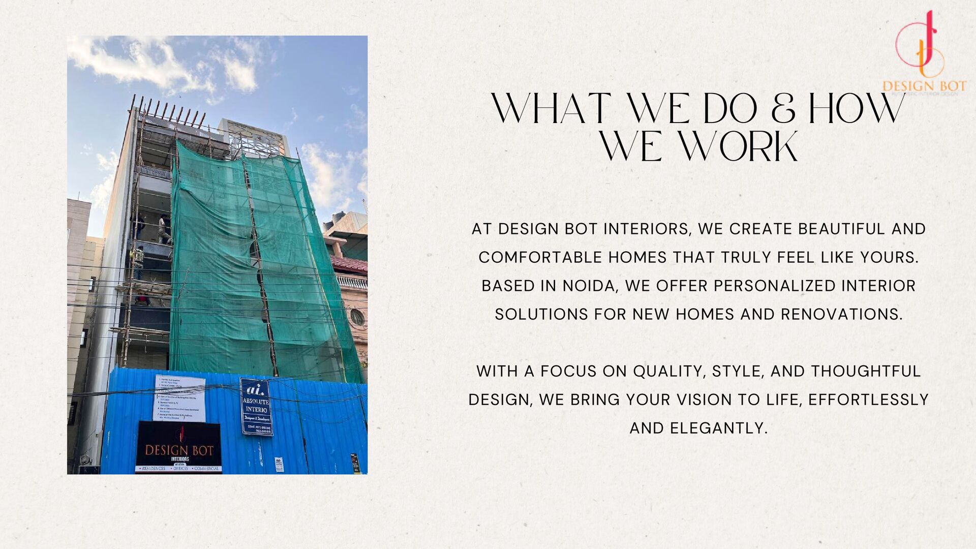 Whether you're building from the ground up or giving your current space a fresh new look, Design Bot Interiors, the best interior designer in Noida 107, offers solutions crafted to match your lifestyle, taste, and budget. From smart space planning to stunning finishes, we make the process seamless and stress-free.