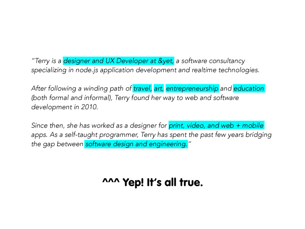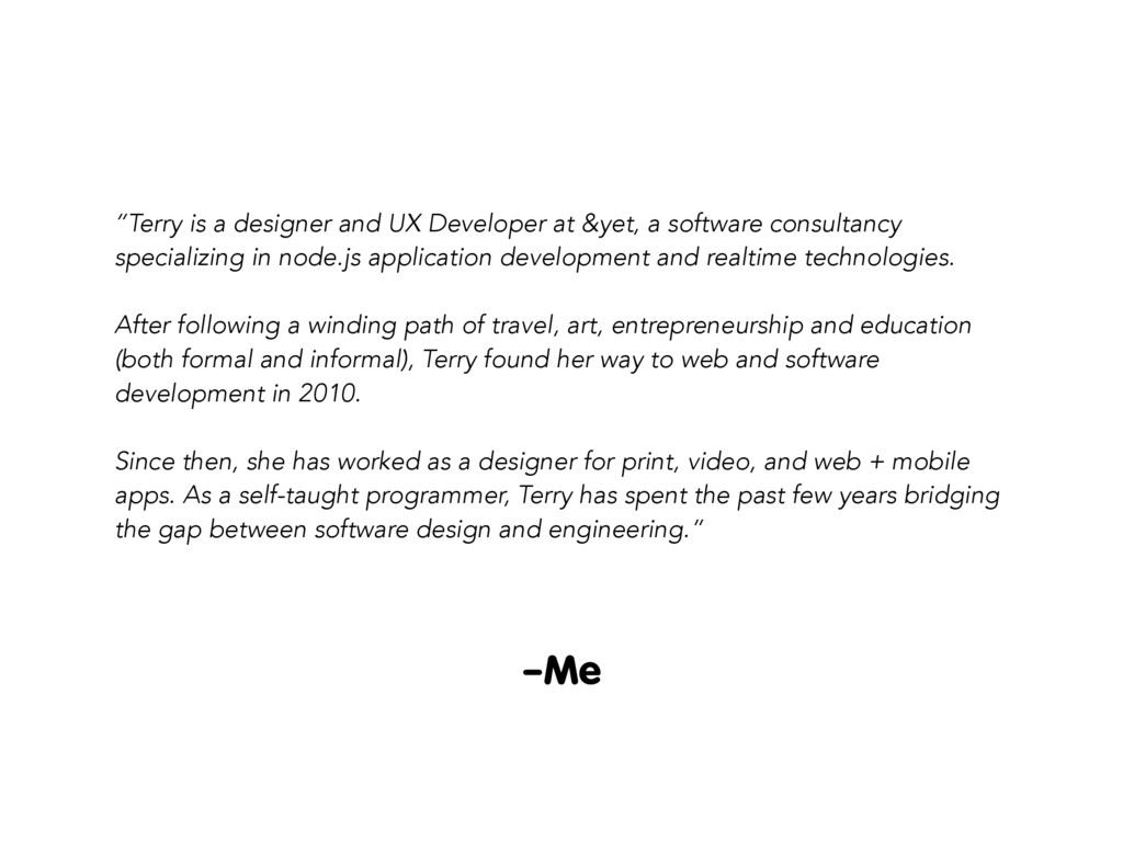 UX Developer at &yet, a software consultancy specializing in node.js application development and realtime technologies. After following a winding path of travel, art, entrepreneurship and education (both formal and informal), Terry found her way to web and software development in 2010. Since then, she has worked as a designer for print, video, and web + mobile apps. As a self-taught programmer, Terry has spent the past few years bridging the gap between software design and engineering.”