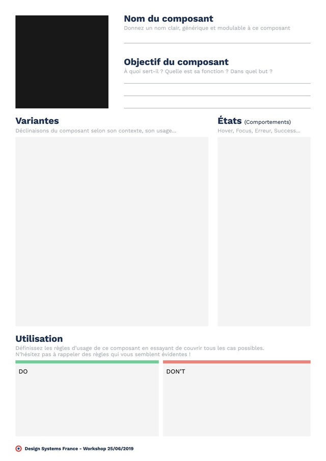 Voici un modèle et guide de documentation de composant de Design System.