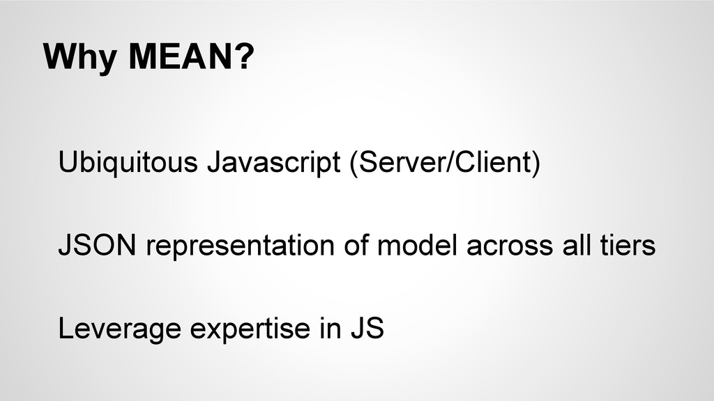 Why MEAN? Ubiquitous Javascript (Server/Client) JSON representation of model across