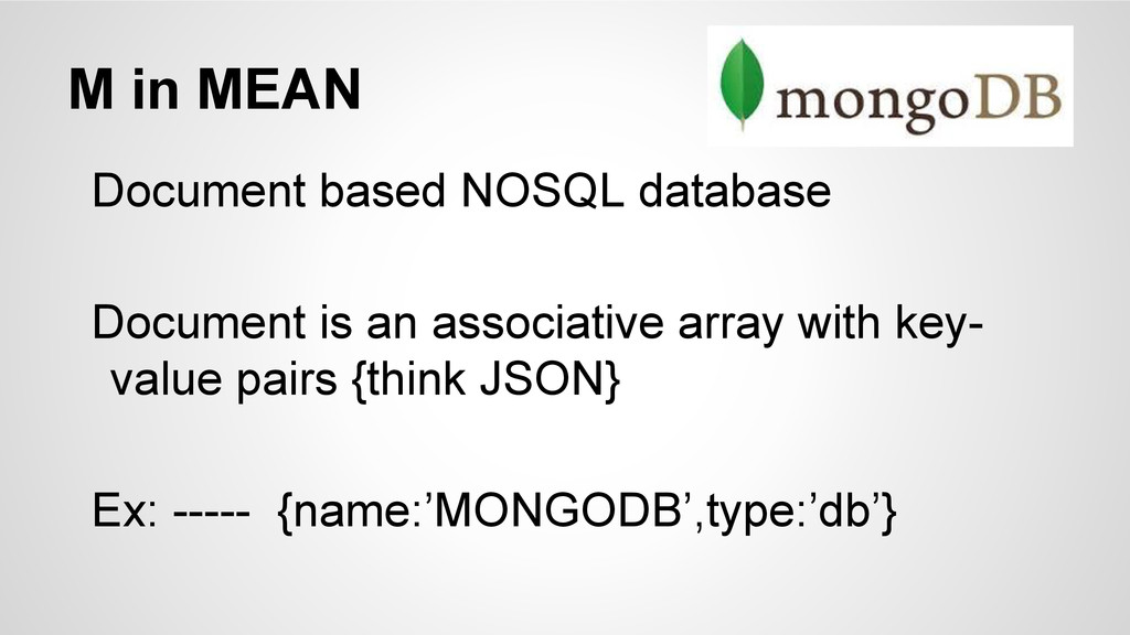 associative array with key- value pairs {think JSON} Ex: ----- {name:’MONGODB’,type:’db’}