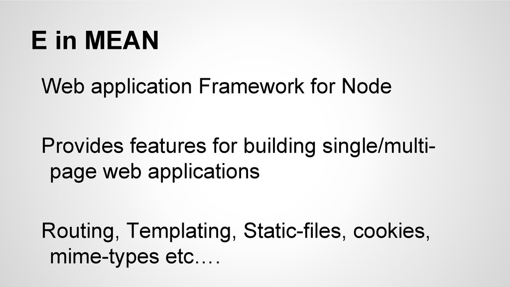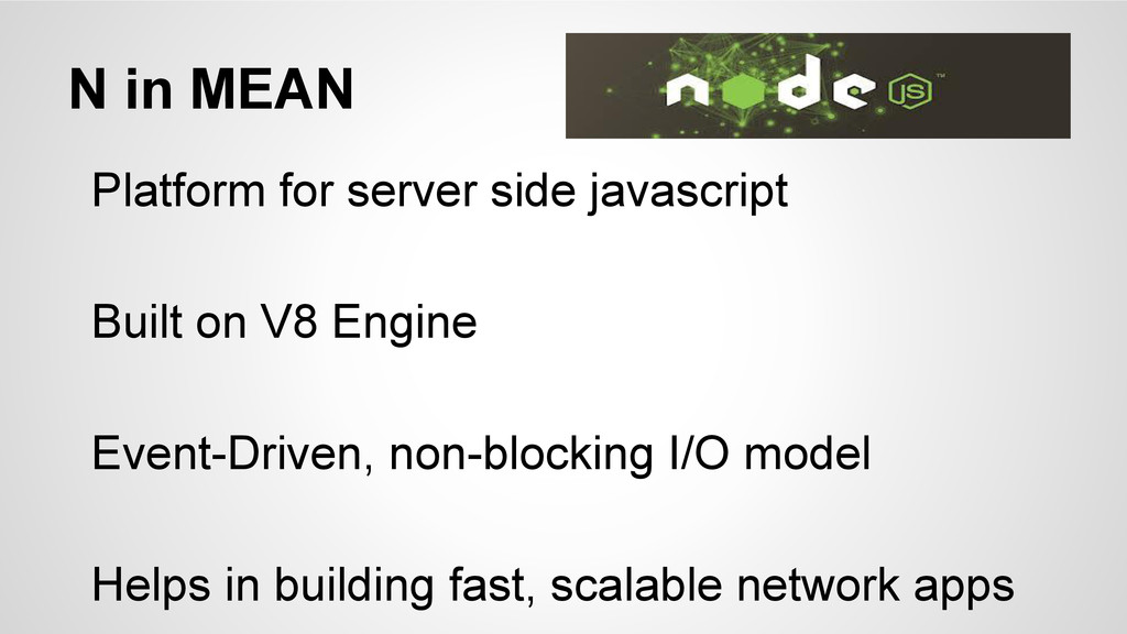 V8 Engine Event-Driven, non-blocking I/O model Helps in building fast, scalable network apps