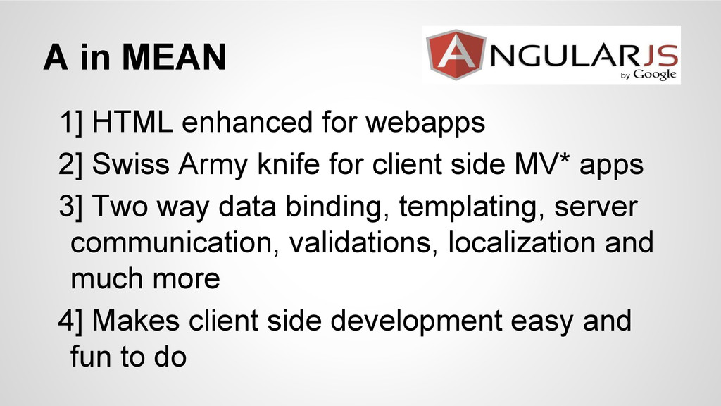 Army knife for client side MV* apps 3] Two way data binding, templating, server communication, validations, localization and much more 4] Makes client side development easy and fun to do