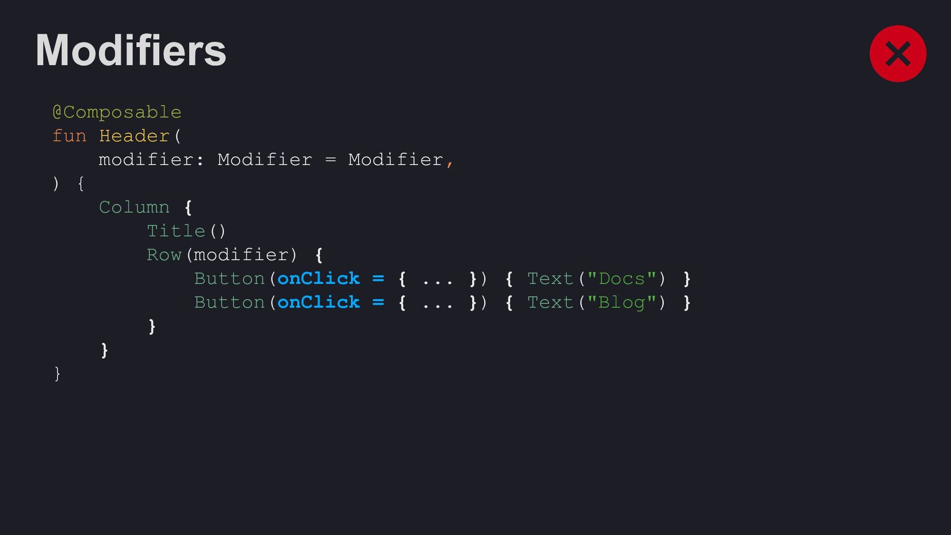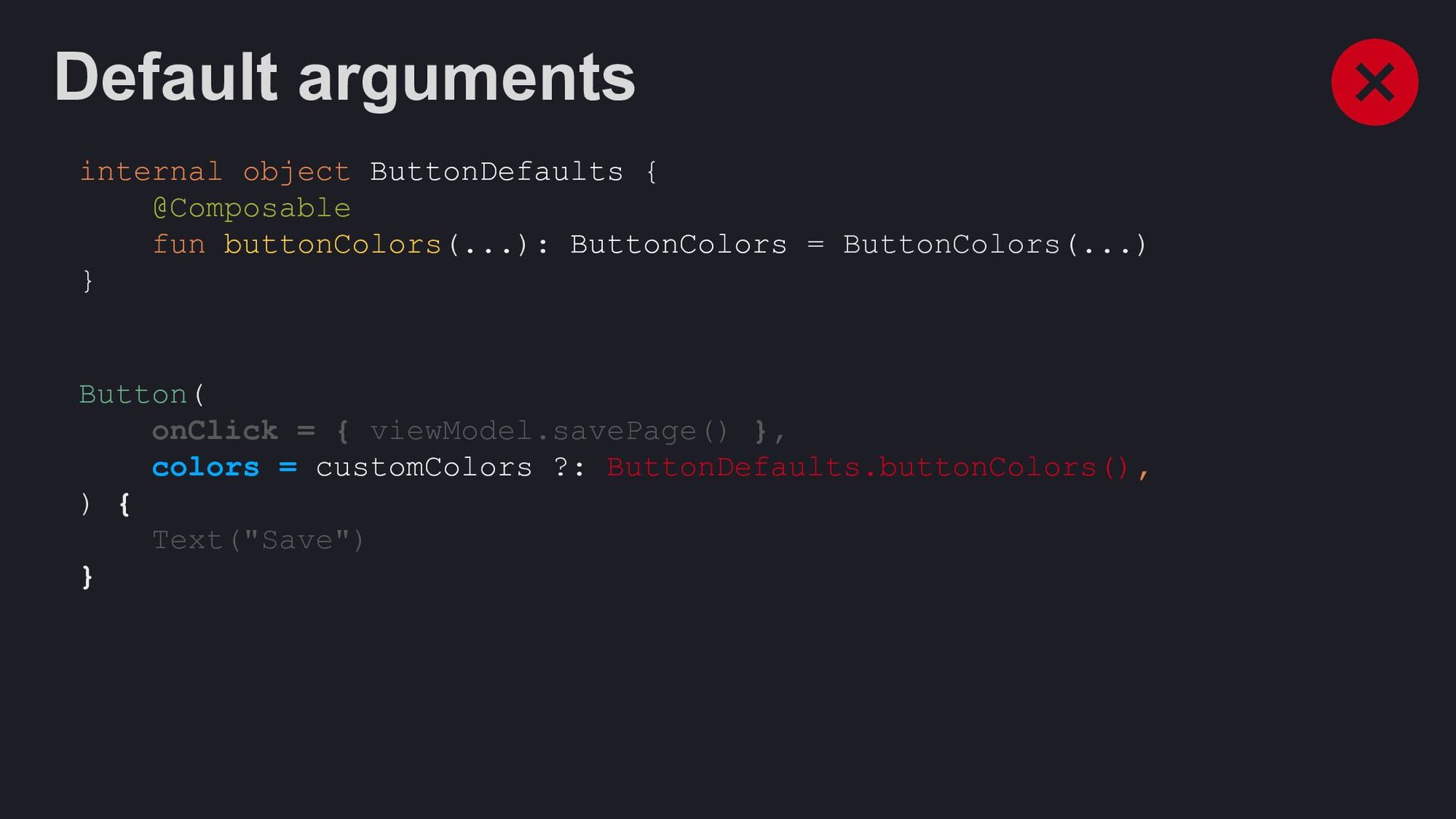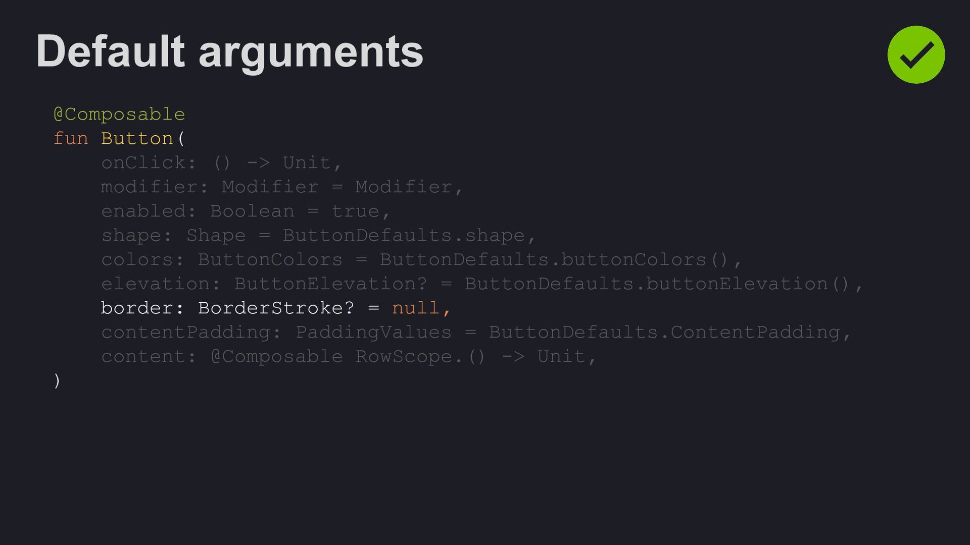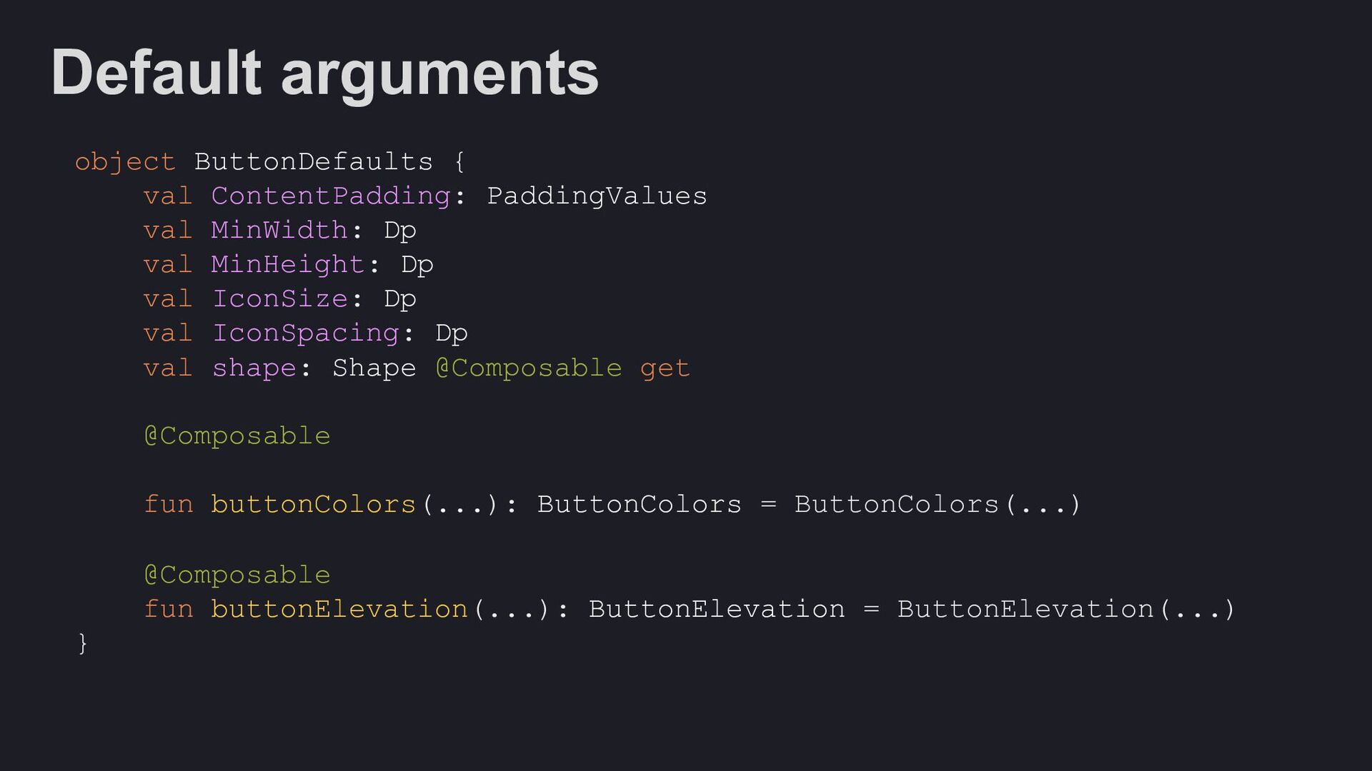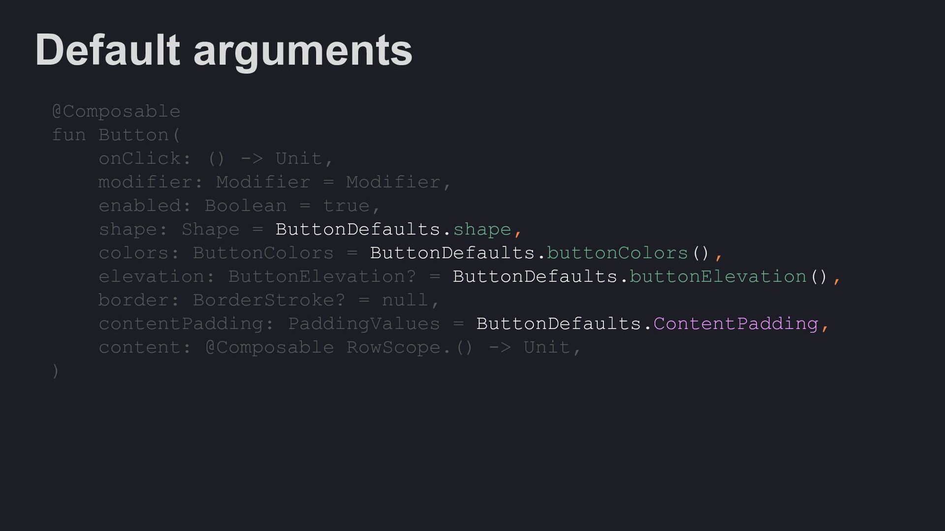 Modifier = Modifier, enabled: Boolean = true, shape: Shape = ButtonDefaults.shape, colors: ButtonColors = ButtonDefaults.buttonColors(), elevation: ButtonElevation? = ButtonDefaults.buttonElevation(), border: BorderStroke? = null, contentPadding: PaddingValues = ButtonDefaults.ContentPadding, content: @Composable RowScope.() -> Unit, )