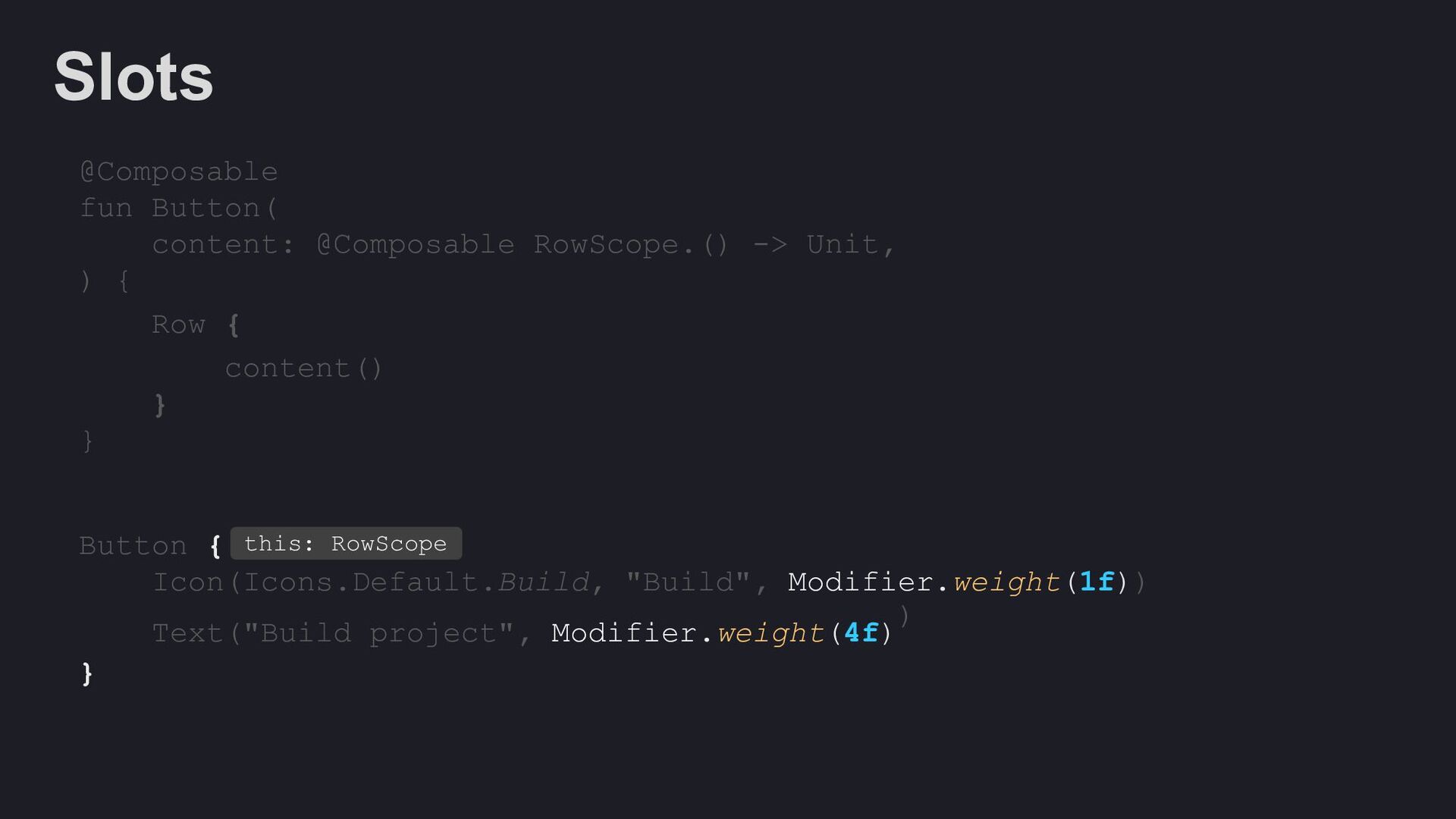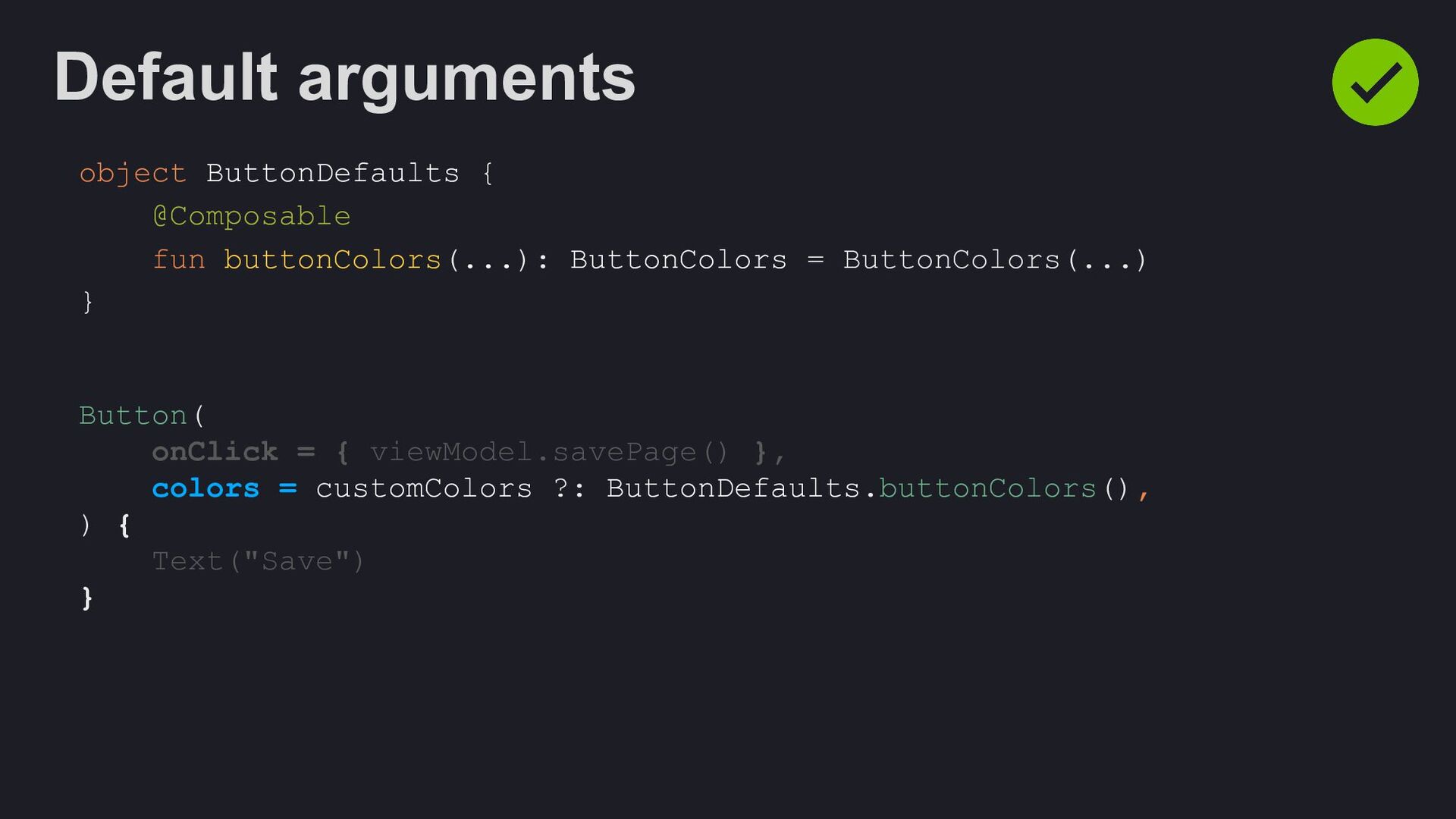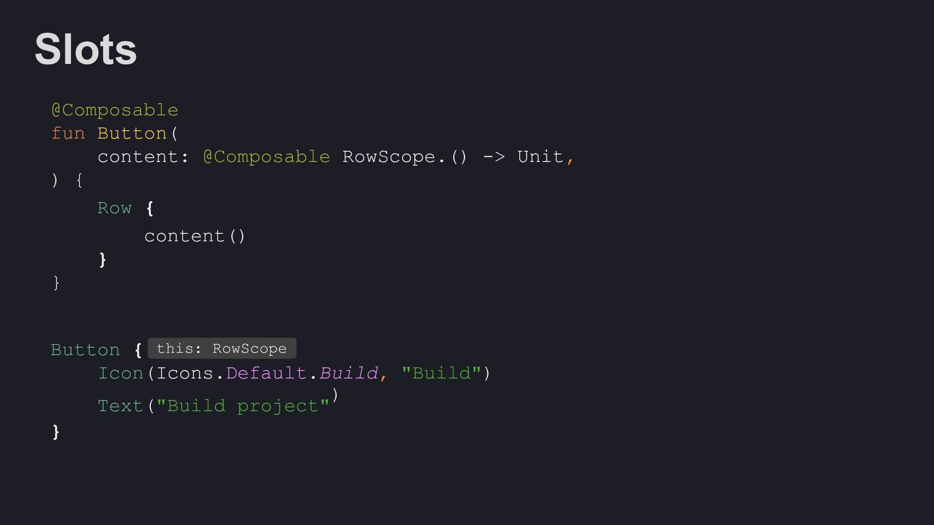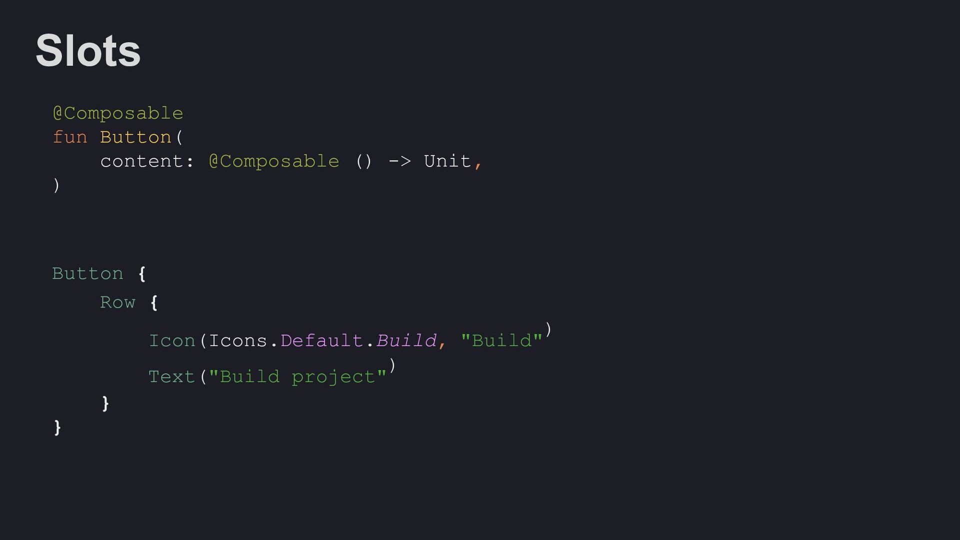 Modifier = Modifier, enabled: Boolean = true, shape: Shape = ButtonDefaults.shape, colors: ButtonColors = ButtonDefaults.buttonColors(), elevation: ButtonElevation? = ButtonDefaults.buttonElevation(), border: BorderStroke? = null, contentPadding: PaddingValues = ButtonDefaults.ContentPadding, content: @Composable RowScope.() -> Unit, )