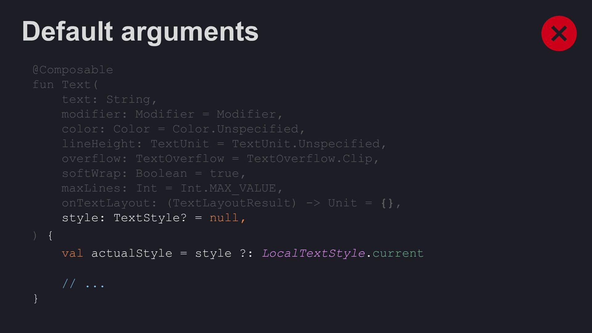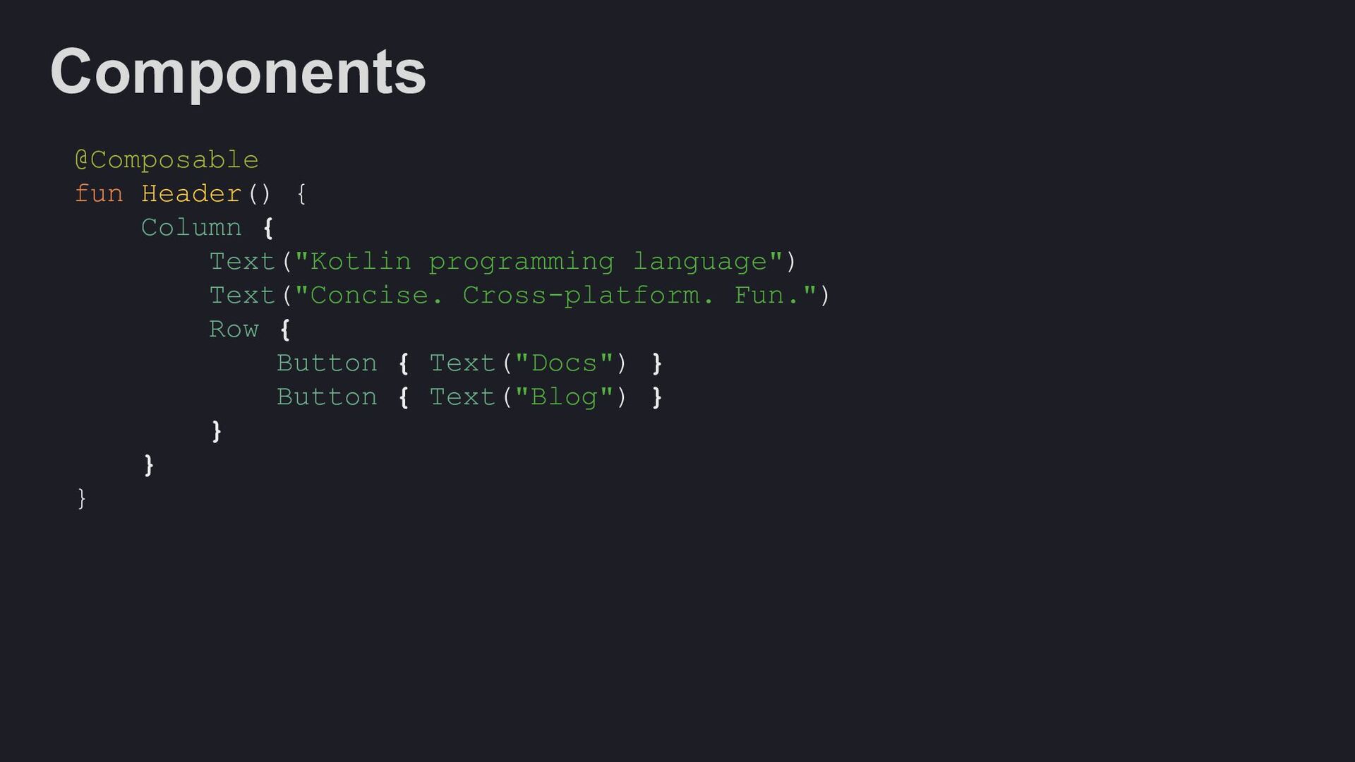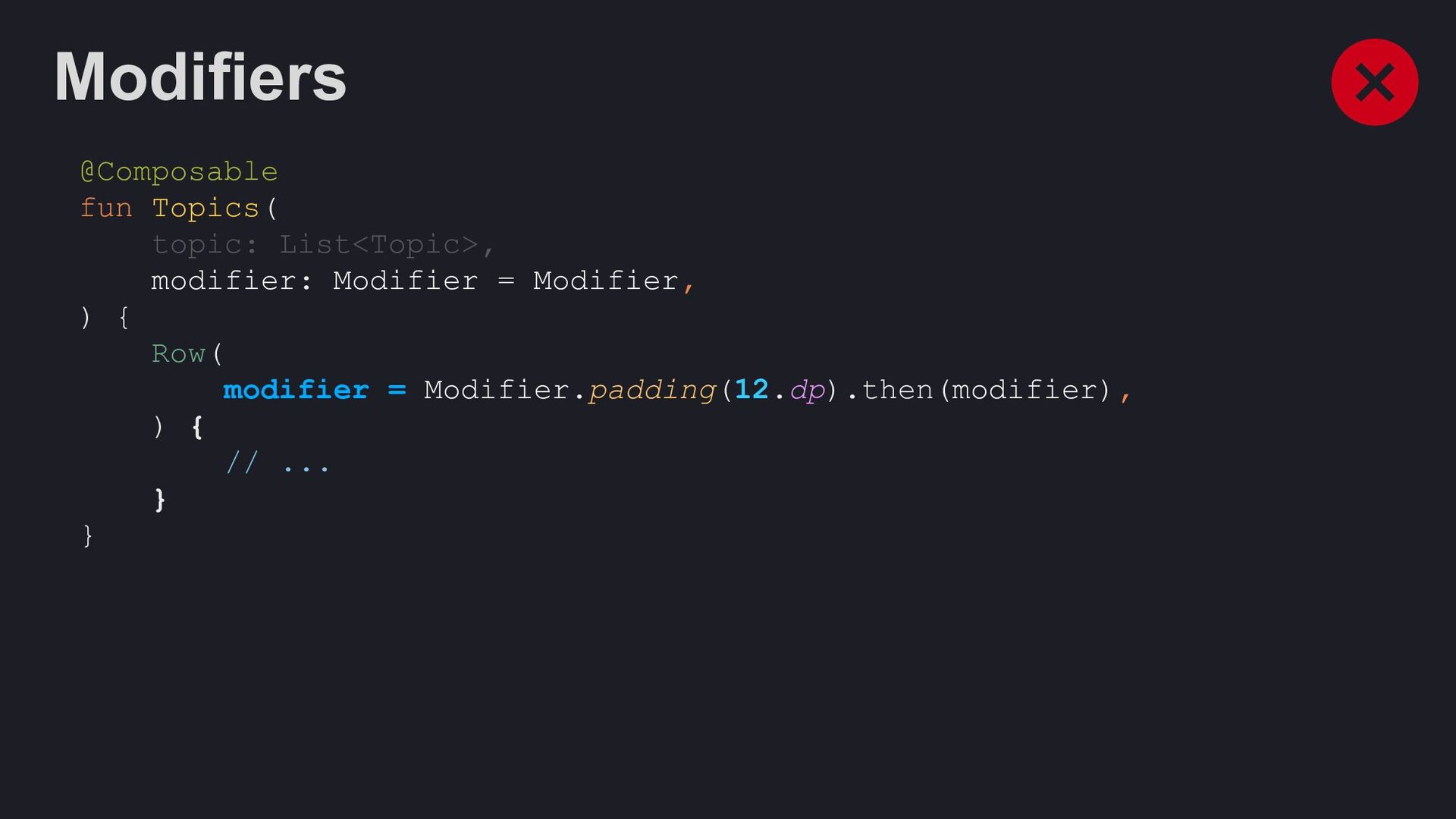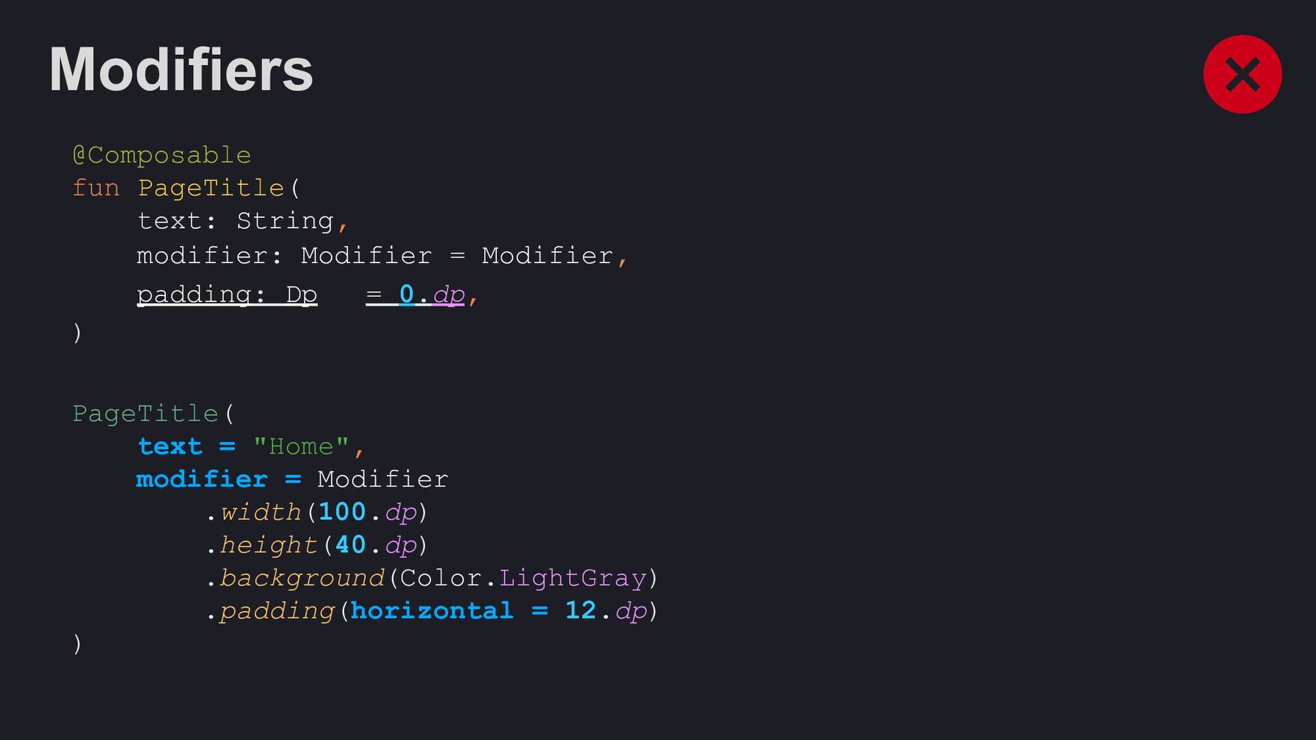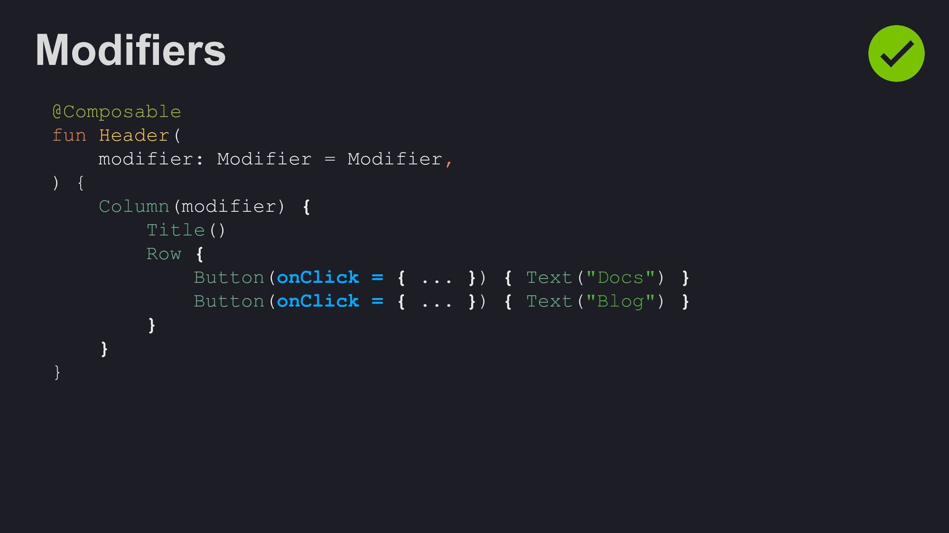 Modifier = Modifier, enabled: Boolean = true, shape: Shape = ButtonDefaults.shape, colors: ButtonColors = ButtonDefaults.buttonColors(), elevation: ButtonElevation? = ButtonDefaults.buttonElevation(), border: BorderStroke? = null, contentPadding: PaddingValues = ButtonDefaults.ContentPadding, content: @Composable RowScope.() -> Unit, )