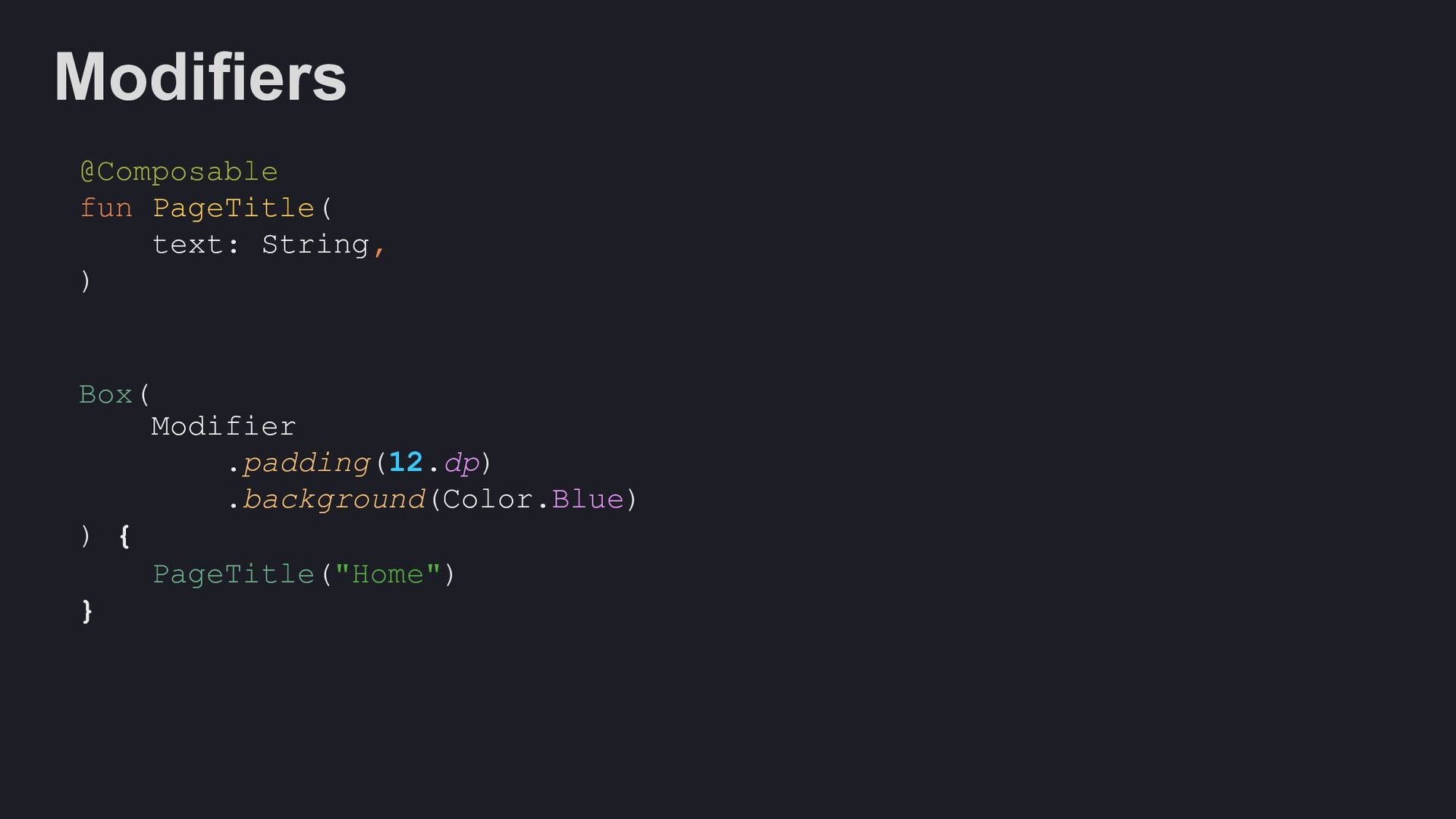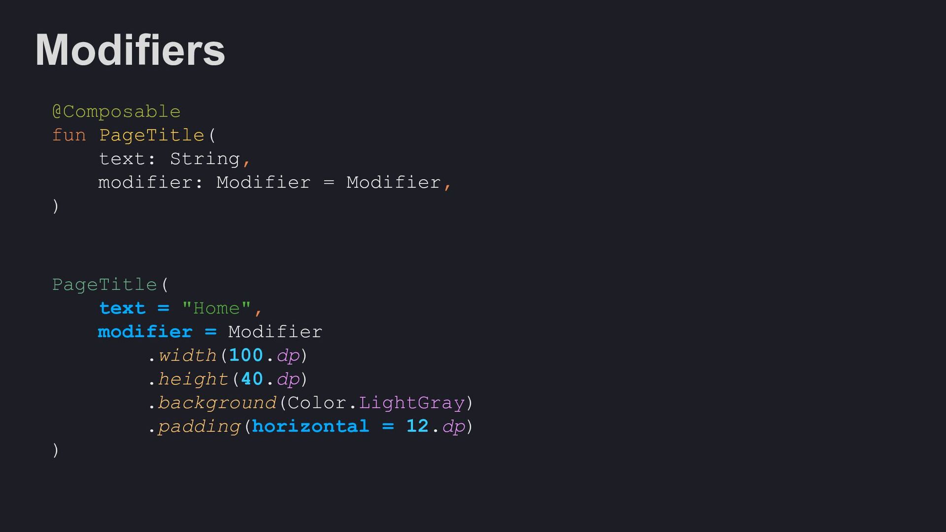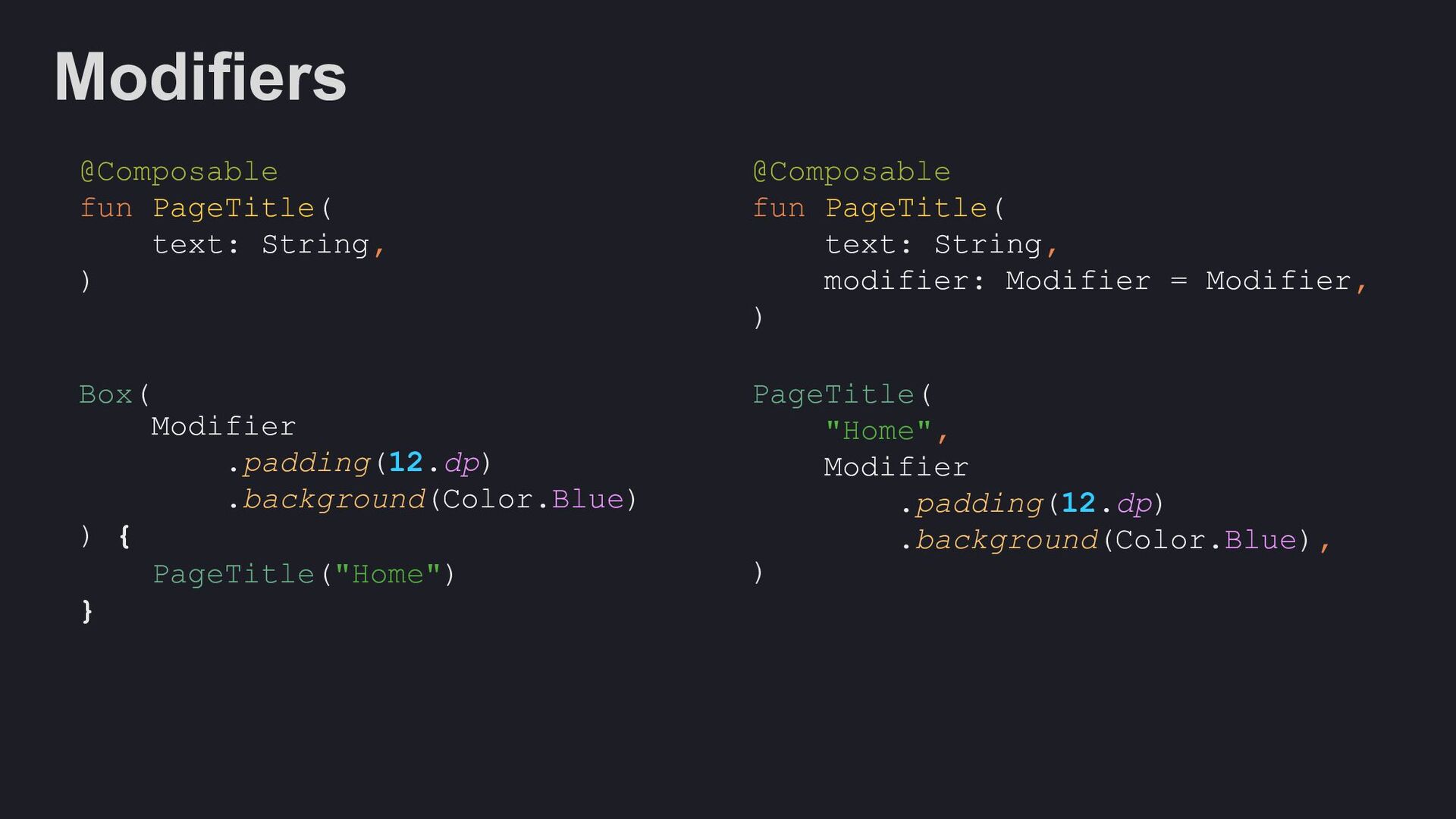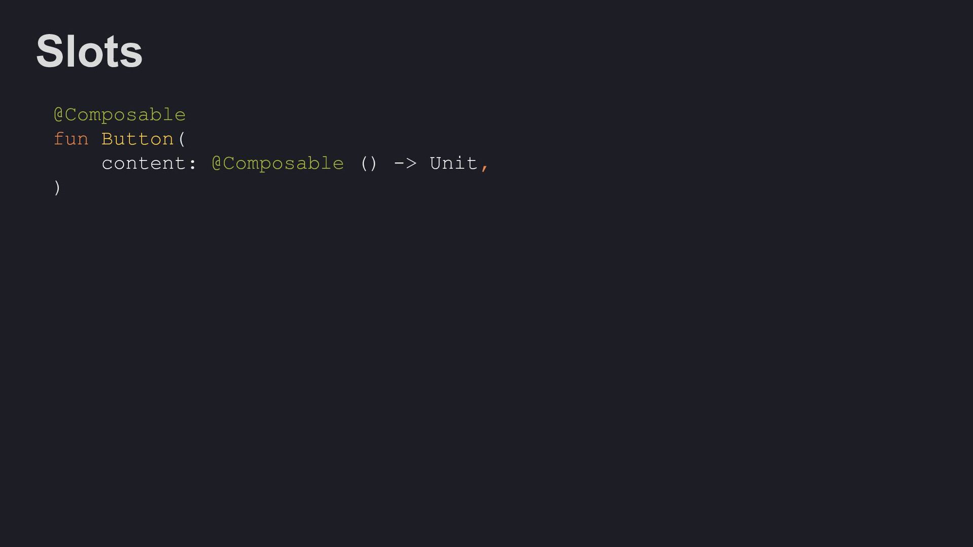 Modifier = Modifier, enabled: Boolean = true, shape: Shape = ButtonDefaults.shape, colors: ButtonColors = ButtonDefaults.buttonColors(), elevation: ButtonElevation? = ButtonDefaults.buttonElevation(), border: BorderStroke? = null, contentPadding: PaddingValues = ButtonDefaults.ContentPadding, content: @Composable RowScope.() -> Unit, )