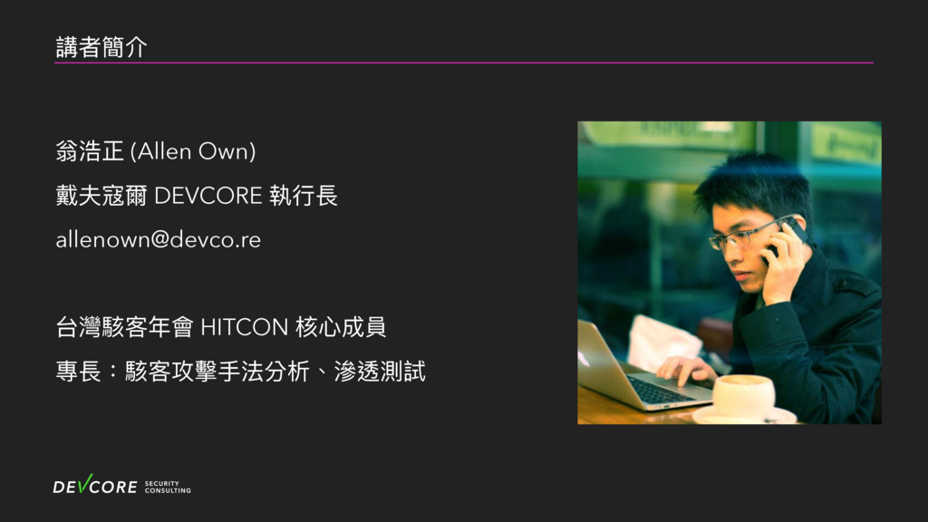 講者簡介 翁浩正 (Allen Own) 戴夫寇爾 DEVCORE 執⾏行行長