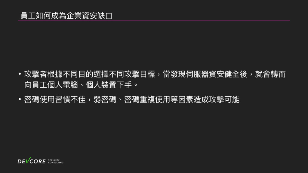 員⼯工如何成為企業資安缺⼝口 • 攻擊者根據不同⽬目的選擇不同攻擊⽬目標,當發現伺服器資安健全後,就會轉⽽而 向員⼯工個⼈人電腦、個⼈人裝置下⼿手。 • 密碼使⽤用習慣不佳,弱密碼、密碼重複使⽤用等因素造成攻擊可能