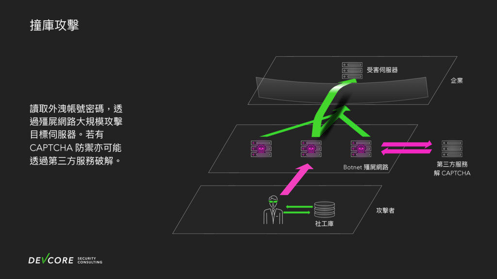 撞庫攻擊 讀取外洩帳號密碼,透 過殭屍網路路⼤大規模攻擊 ⽬目標伺服器。若若有 CAPTCHA 防禦亦可能 透過第三⽅方服務破解。 受害伺服器 企業 第三⽅方服務