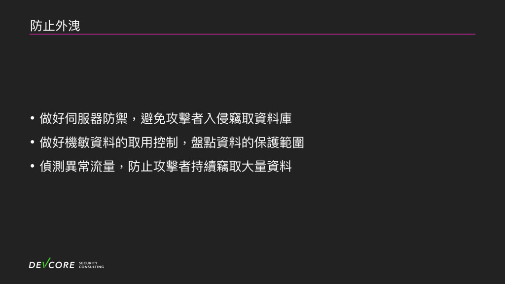 防⽌止外洩 • 做好伺服器防禦,避免攻擊者入侵竊取資料庫 • 做好機敏資料的取⽤用控制,盤點資料的保護範圍 • 偵測異異常流量量,防⽌止攻擊者持續竊取⼤大量量資料