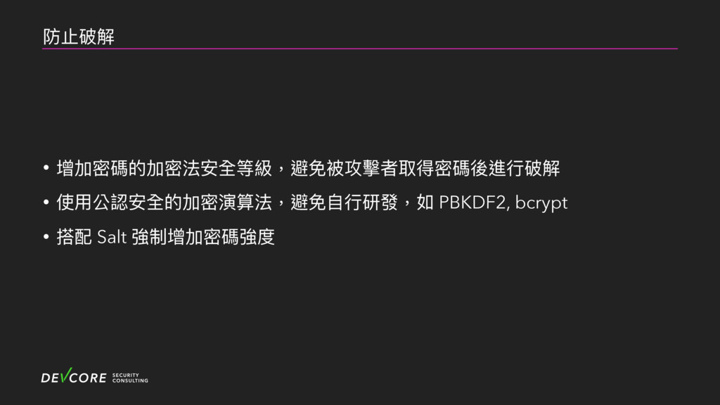 防⽌止破解 • 增加密碼的加密法安全等級,避免被攻擊者取得密碼後進⾏行行破解 • 使⽤用公認安全的加密演算法,避免⾃自⾏行行研發,如 PBKDF2, bcrypt • 搭配 Salt