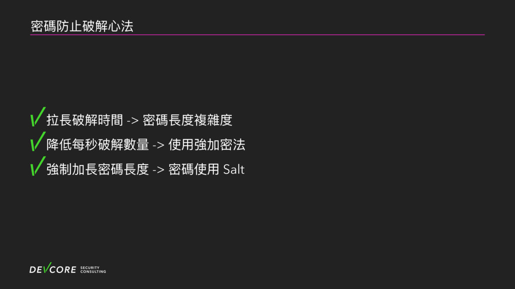 密碼防⽌止破解⼼心法 拉長破解時間 -> 密碼長度複雜度 降低每秒破解數量量 -> 使⽤用強加密法 強制加長密碼長度 -> 密碼使⽤用