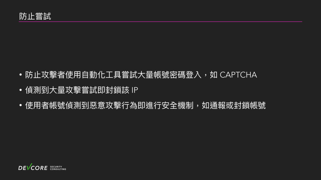 防⽌止嘗試 • 防⽌止攻擊者使⽤用⾃自動化⼯工具嘗試⼤大量量帳號密碼登入,如 CAPTCHA • 偵測到⼤大量量攻擊嘗試即封鎖該 IP • 使⽤用者帳號偵測到惡惡意攻擊⾏行行為即進⾏行行安全機制,如通報或封鎖帳號