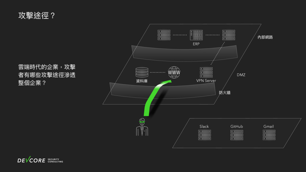防火牆 VPN Server Slack GitHub Gmail 資料庫 ERP 內部網路路 DMZ 主網站