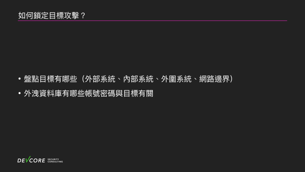 如何鎖定⽬目標攻擊? • 盤點⽬目標有哪些(外部系統、內部系統、外圍系統、網路路邊界) • 外洩資料庫有哪些帳號密碼與⽬目標有關