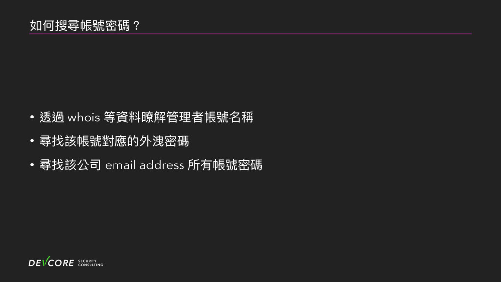 如何搜尋帳號密碼? • 透過 whois 等資料瞭解管理理者帳號名稱 • 尋找該帳號對應的外洩密碼 • 尋找該公司 email