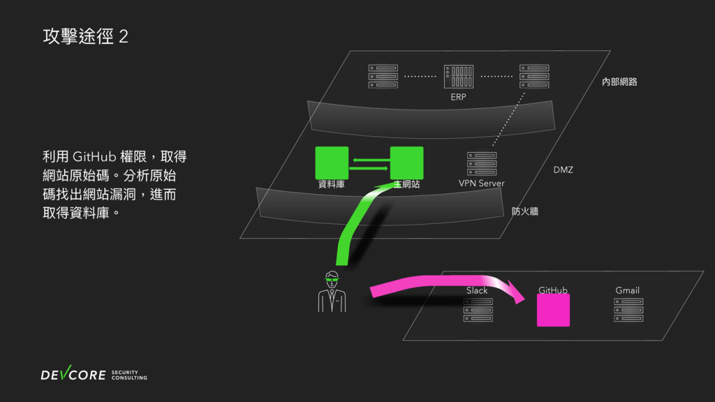 攻擊途徑 2 利利⽤用 GitHub 權限,取得 網站原始碼。分析原始 碼找出網站漏洞洞,進⽽而 取得資料庫。 防火牆 VPN