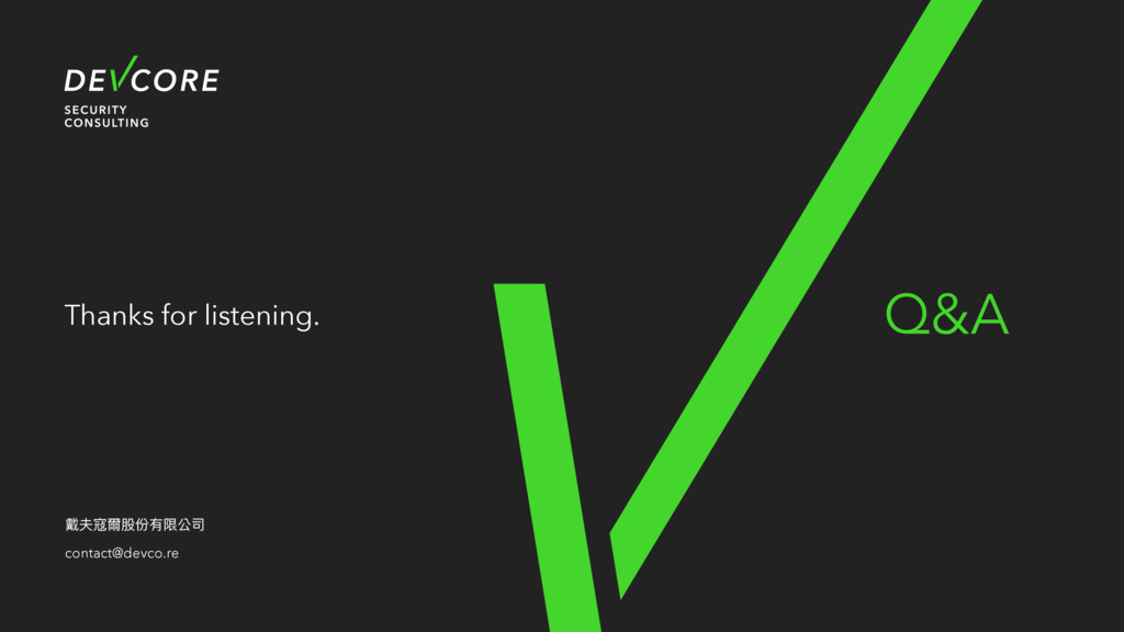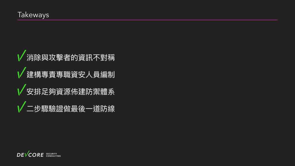 Takeways 消除與攻擊者的資訊不對稱 建構專責專職資安⼈人員編制 安排⾜足夠資源佈建防禦體系 ⼆二步驟驗證做最後⼀一道防線