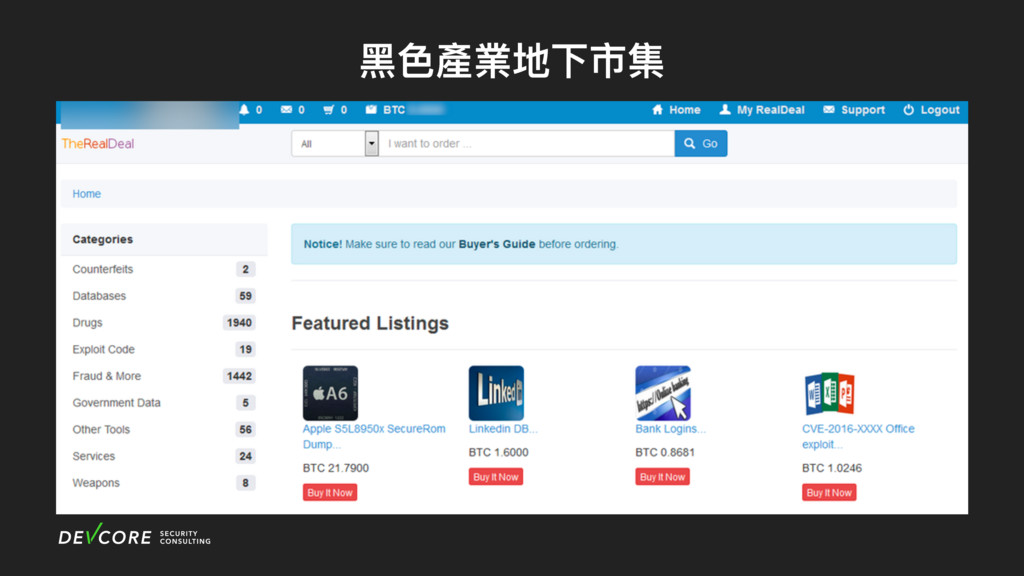 ⿊黑⾊色產業 Black Market 有需求,就有供給;有利利益,就有產業。 正因有需求、有利利益,才會有駭客集團進⾏行行組織性的攻擊。