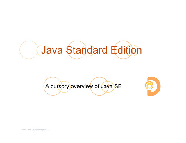 “historic” Java platform Considered the “core” Java platform Used for browser plug-ins to stand-alone Java applications Extended to support enterprise application development (Java EE) Constrained to support micro application development (Java ME) Typically discussed in terms of its: Runtime environment (JRE) Development environment (JDK)