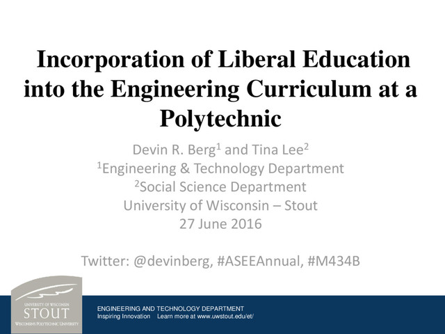Incorporation of Liberal Education into the Engineering Curriculum at a Polytechnic Devin R. Berg1 and Tina Lee2 1Engineering & Technology Department 2Social Science Department University of Wisconsin – Stout 27 June 2016 Twitter: @devinberg, #ASEEAnnual, #M434B