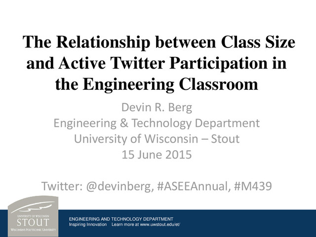 The Relationship between Class Size and Active Twitter Participation in the Engineering Classroom Devin R. Berg Engineering & Technology Department University of Wisconsin – Stout 15 June 2015 Twitter: @devinberg, #ASEEAnnual, #M439