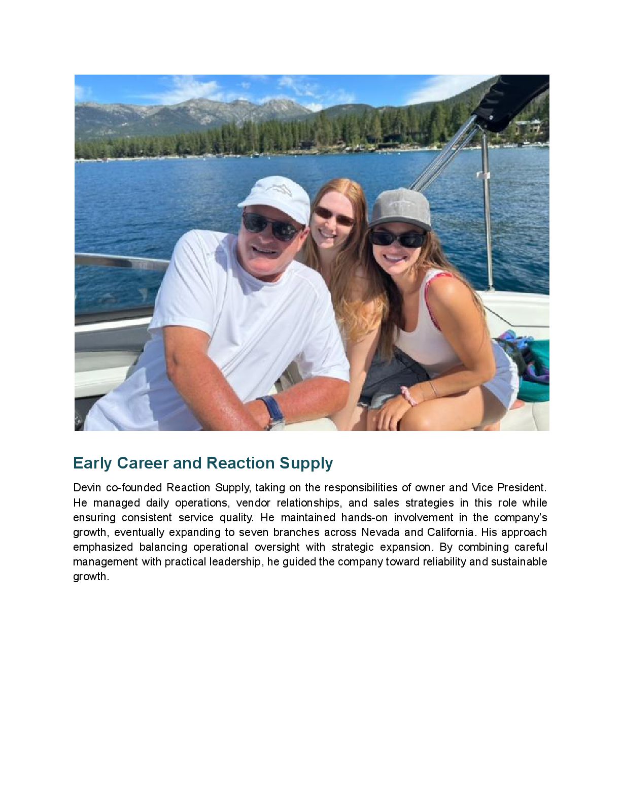 Devin Doyle co-founded Reaction Supply, where he served as owner and Vice President. He oversaw sales operations, vendor relationships, and business growth strategies in this role. Under his guidance, the company expanded across Nevada and California, demonstrating his ability to scale a business while maintaining service quality. He was involved in day-to-day operations, ensuring that the company upheld its standards and consistently met client expectations throughout its expansion.