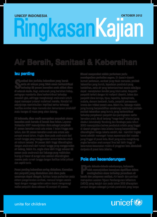 dasar dapat berkurang. Bagi Indonesia, ini berarti Indonesia perlu mencapai angka peningkatan akses air bersih hingga 68,9 persen dan 62, 4 persen, untuk sanitasi. Saat ini, Indonesia tidak berada pada arah yang tepat untuk mencapai target MDG untuk masalah air bersih MDG pada tahun 2015. Perhitungan dengan menggunakan kriteria MDG nasional Indonesia untuk air bersih dan data dari sensus tahun 2010 menunjukkan bahwa Indonesia harus mencapai tambahan 56,8 juta orang dengan persediaan air bersih pada tahun 2015. Di sisi lain, jika kriteria Program Pemantauan Bersama WHO-UNICEF (JMP) untuk air bersihii akan digunakan, Indonesia harus mencapai tambahan 36,3 juta orang pada tahun 2015. Saat ini, bahkan di provinsi-provinsi yang berkinerja lebih baik (Jawa Tengah dan DI Yogyakarta), sekitar satu dari tiga rumah tangga tidak memiliki akses ke persediaan air bersih (Gambar 1). Perbandingan dengan tahun 2007 menunjukkan akses air bersih pada tahun 2010 telah mengalami penurunan kira-kira sebesar tujuh persen. Kondisi terbalik ini pada umumnya disebabkan oleh penurunan di daerah perkotaan (sebesar 23 persen sejak tahun 2007, Gambar 2). Akses ke air bersih di Jakarta telah mengalami penurunan dari 63 persen pada 2010 menjadi 28 persen pada tahun 2007, menurut Riskesdas. Yang mengherankan, dua kelompok kuintil tertinggi juga mengalami penurunan aksesterhadap air bersih masing- masing sebesar 8 dan 32 persen dibandingkan dengan tahun 2007. Mereka yang berasal dari kelompok mampu membeli air minum kemasan atau botol: sepertiga rumah tangga perkotaan di Indonesia melakukannya pada tahun 2010. 1 ya atu ain a an an an at h s. ek a a gor ang Pola dan kecenderungan Pada dekade-dekade sebelumnya, Indonesia telah menunjukkan kemajuan signifikan dalam meningkatkan akses ke pelayanan persediaan air bersih dan sanitasi. Sasaran air bersih dan sanitasi Tujuan Pembangunan Milenium (MDG) yang ketujuh adalah mengurangi sampai setengah jumlah penduduk yang tidak memiliki akses ke air bersih yang layak minum dan sanitasi dasar. Bagi Indonesia, ini berarti pencapaian tingkat akses sebesar 68,9 dan 62,4 persen, masing-masing untuk air bersih dan sanitasi. Saat ini, Indonesia tidak berada pada arah yang tepat untuk mencapai target air bersih MDG pada tahun 2015. Perhitungan dengan menggunakan kriteria MDG nasional Indonesia untuk air bersih dan data dari sensus 2010 menunjukkan bahwa Indonesia harus mencapai tambahan 56,8 juta orang dengan persediaan air bersih pada tahun 2015. Di sisi lain, jika kriteria Program Pemantauan Bersama 0% 20% 40% 60% 80% 100% Central java Di Yogyakarta gorontalo north Maluku West nusa Tenggara East java southeast sulawesi Lampung Bengkulu Central sulawesi West java north sumatra West sulawesi Bali West sumatra south sulawesi Maluku south kalimantan riau West Papua north sulawesi East kalimantan jambi aceh East nusa Tenggara south sumatra Banten West kalimantan riau islands Central kalimantan Papua Bangka Belitung Dki jakarta Figure 1. Percentage of households with access to improved water sources, by province. Source: Riskesdas 2010. JMP criteria, bottled water not included. gambar 1. Prosentase rumah tangga dengan akes ke sumber air bersih yang lebih baik, menurut provinsi. Sumber: Riskesdas 2010. Kriteria JMP, tidak termasuk air botol kemasan Dki jakarta Bangka Belitung Papua kalteng kepri kalbar Banten sumsel nTT aceh jambi kaltim sulut Papua Barat riau kalsel Maluku sulsel sumbar Bali sulbar sumut jawa Barat sulteng Bengkulu Lampung sultra jawa Timur nTB gorontalo Di Yogyakarat jawa Tengah Gambar 1. Prosentase rumah tangga dengan akes ke sumber air bersih yang lebih baik, menurut provinsi. Sumber: Riskesdas 2010. Kriteria JMP, tidak termasuk air botol kemasan Sejak tahun 1993, Indonesia telah menunjukkan peningkatan dua kali lipat prosentase rumah tangga dengan akses ke fasilitas sanitasi yang lebih baik, tetapi masih berada pada arah yang belum tepat untuk mencapai target sanitasi MDG 2015. Untuk mencapai target sanitasi nasional MDG, diperlukan pencapaian tambahan 26 juta orang dengan sanitasi yang lebih baik pada tahun 2015. Perencanaan pada jangka panjang memerlukan pencapaian angka-angka yang lebih besar: Data Riskesdas 2010 menunjukkan bahwa secara keseluruhan, kira-kira 1 16 juta orang masih kekurangan sanitasi yang memadai. Buang air besar di tempat terbuka merupakan masalah kesehatan dan sosial yang perlu mendapatkan perhatian segera. Sekitar 17 persen rumah tangga pada tahun 2010 atau sekitar 41 juta orang masih buang air besar di tempat terbuka. Ini meliputi lebih dari sepertiga penduduk di Gorontalo, Sulawesi Barat, Sulawesi Tengah, Nusa Tenggara Barat dan Kalimantan Barat. Praktek tersebut bahkan ditemukan di provinsi-provinsi dengan cakupan sanitasi yang relatif tinggi, dan pada penduduk perkotaan dan di seluruh kuintil (Gambar 3 dan 4). WHO-UNICEF (JMP) untuk air bersih2 akan digunakan, Indonesia harus mencapai tambahan 36,3 juta orang pada tahun 2015. Saat ini, bahkan di provinsi-provinsi yang berkinerja lebih baik (Jawa Tengah dan DI Yogyakarta), sekitar satu dari tiga rumah tangga tidak memiliki akses ke persediaan air bersih (Gambar 1). Perbandingan dengan tahun 2007menunjukkanaksesair bersihpada tahun 2010telah mengalami penurunan kira-kira sebesartujuhpersen. Pembalikaninipada umumnya disebabkan olehpenurunandi daerah perkotaan(sebesar 23 persensejaktahun 2007,Gambar2). Akseske air bersihdi Jakartatelah mengalami penurunan dari63persenpada 2010 menjadi28 persenpada tahun 2007, menurut Riskesdas. Yang mengherankan, duakelompok kekayaantertinggijuga telah mengalami penurunanakses ke air bersih masing-masing sebesar 8 dan32persen dibandingkan dengan tahun 2007. Mereka yangmampu membelinyamembeli airminumkemasanatau botol: sepertigarumah tanggaperkotaandi Indonesiamelakukannyapada tahun 2010. Sejak tahun 1993, Indonesia telah menunjukkan peningkatan dua kali lipat prosentase rumah tangga dengan akses ke fasilitas sanitasi yang lebih baik, tetapi masih berada pada arah y