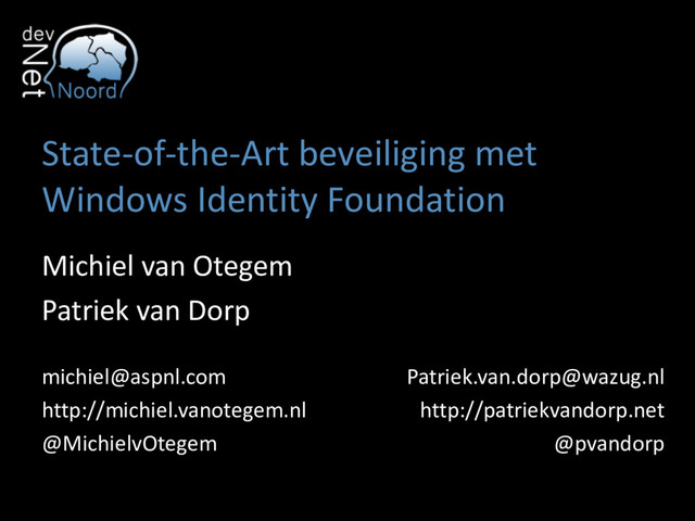 verandering – Identiteit staat centraal, niet authenticatie – Model van WIF is protocol onafhankelijk – Federated Identity maakt meer mogelijk • Cross domain, Constrained delegation/impersonation • In .NET 4.5 integraal onderdeel van framework – Elk Identity object erft van ClaimsIdentity • ASP.NET ondersteunt standaard IdPs – OAuth, OpenID, Facebook