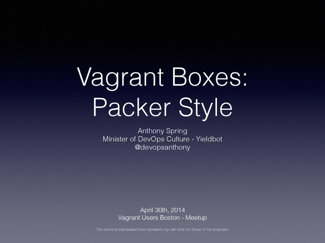 This presentation offered a high level introduction to utilizing Packer to build base boxes for Vagrant. Also included in the talk was Racker, a Ruby DSL wrapper for Packer, as well as how Yieldbot wraps its use of Packer/Racker into an internal project called Planet Express.