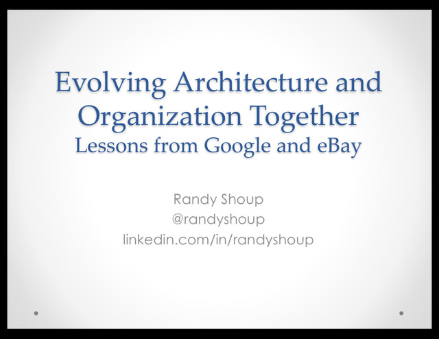 Summary: The “right” architecture and organization depends on the size and scale of your company. The only constant is change, and what works for 5 engineers does not work for 5000. Based upon lessons from Google and eBay, learn how to evolve both technology and organization together successfully.