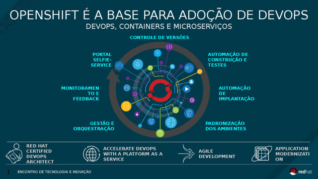 DE VERSÕES AUTOMAÇÃO DE IMPLANTAÇÃO MONITORAMEN TO E FEEDBACK PADRONIZAÇÃO DOS AMBIENTES GESTÃO E ORQUESTRAÇÃO AUTOMAÇÃO DE CONSTRUÇÃO E TESTES RED HAT CERTIFIED DEVOPS ARCHITECT AGILE DEVELOPMENT ACCELERATE DEVOPS WITH A PLATFORM AS A SERVICE APPLICATION MODERNIZATI ON OPENSHIFT É A BASE PARA ADOÇÃO DE DEVOPS DEVOPS, CONTAINERS E MICROSERVIÇOS