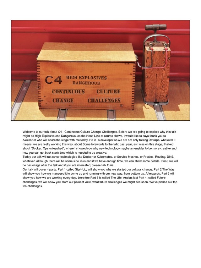 Challenges. Before we are going to explore why this talk might be High Explosive and Dangerous, as the Head Line of course shows, I would like to says thank you to Alexander who will share the stage with me today. He is a developer so we are not only talking DevOps, whatever it means, we are really working this way. about Some forewords to the talk: Last year, as I was on this stage, I talked about “Docker: Ops unleashed”, where I showed you why new technology maybe an enabler to be more creative and how you can get back slack time which is needed to be creative. Today our talk will not cover technologies like Docker or Kubernetes, or Service Meshes, or Proxies, Routing, DNS, whatever, although there will be some side links and if we have enough time, we can show some details. If not, we will be backstage after the talk and if you are interested, please talk to us. Our talk will cover 4 parts: Part 1 called Start-Up, will show you why we started our cultural change. Part 2 The Way will show you how we managed it to come up and running with our new way, from bottom up. Afterwards, Part 3 will show you how we are working every day, therefore Part 3 is called The Life. And as last Part 4, called Future challenges, we will show you, from our point of view, what future challenges we might see soon. We’ve picked our top ten challenges.
