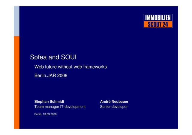 architectures Sofea - Service-Oriented Front-End Architecture „Life above the Service Tier“, Ganesh Prasad Focuses on XML/XSD, not JSON Similar: SOUI - Service-Oriented User Interface „MVC is Dead“, Nolan Wright Focuses on Messages Direct access to services with AJAX Browser as (MVC) controller No HTML on server, no Web Framework, even no Application on Server possible