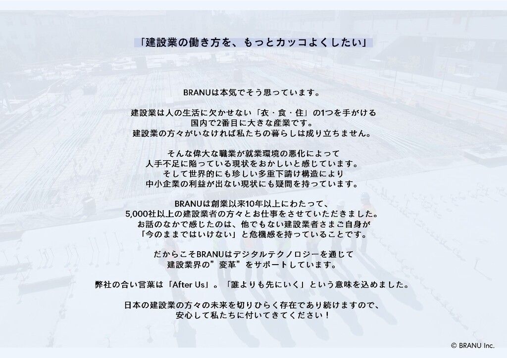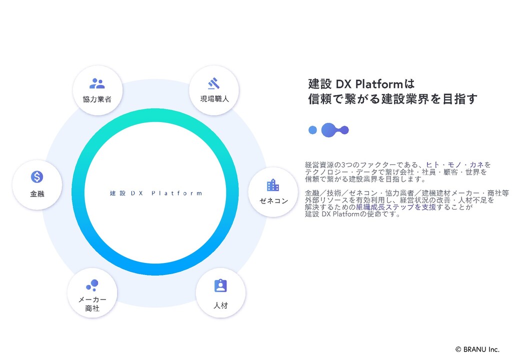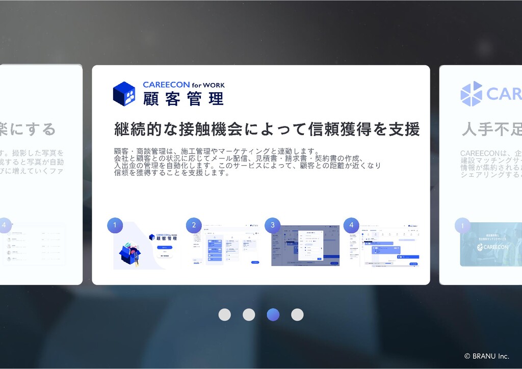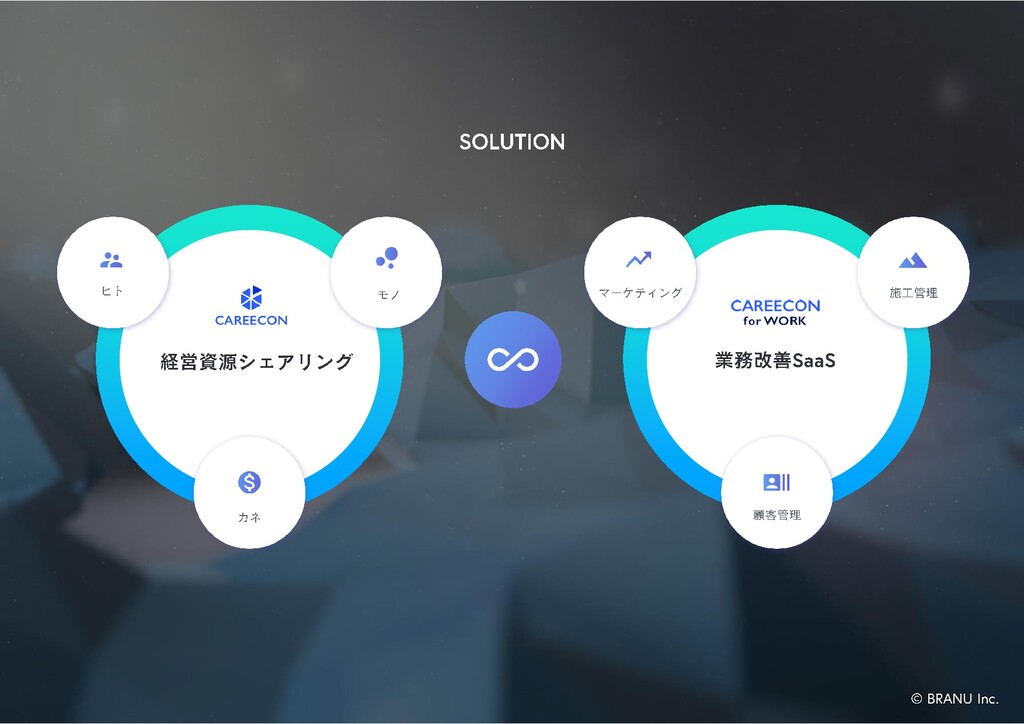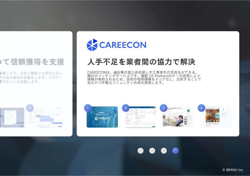 1 CAREECONは、企業広報活動を自動化することに特化した新しい 建設マッチングサービスです。建設 DX Platformのデータ連携により 情報が集約されるため技術や信用情報をスコア化し、経営資源を シェアリングすることで、高次のコミュニティ形成を実現します。