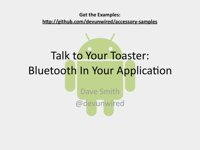 device classes • BluetoothProfile – Common interface for all supported device profiles – Reports connec6on status of any devices matching the profile – Profile-specific ac6ons implemented in subclasses • Use BluetoothAdapter.getProfileProxy() to register a ServiceListener callback for connec6on events – Binder Proxy to control device's Bluetooth Service • ServiceListener is passed an instance of the profile when a device matching it is connected. 18