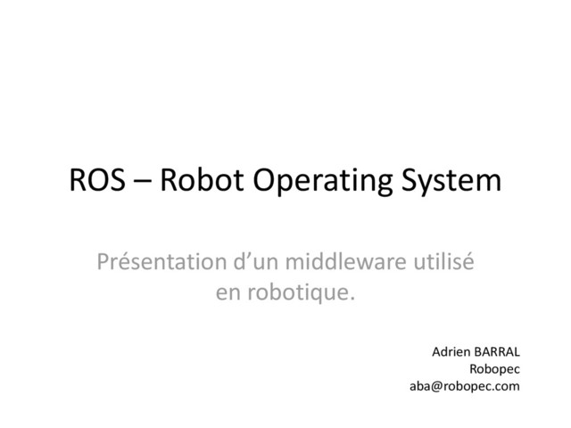 est implémenté en C++ et Python • D’autres langages ont été supportés par la suite : LISP, C#, GO, Java, R, Ruby… • Un bridge existe pour utiliser ROS dans des applis WEB : rosbridge_suite : Un serveur websocket permettant à un client JS de s’abonner et de publier n’importe quelle données ROS.