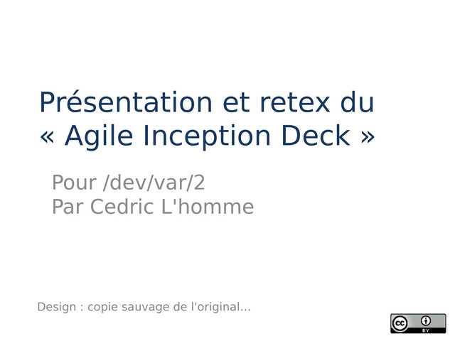 Présentation et retour d'experience sur le "Agile Inception Deck" tiré du livre "The Agile Samurai : How Agile Masters Deliver Great Software" de Jonathan Rasmusson.