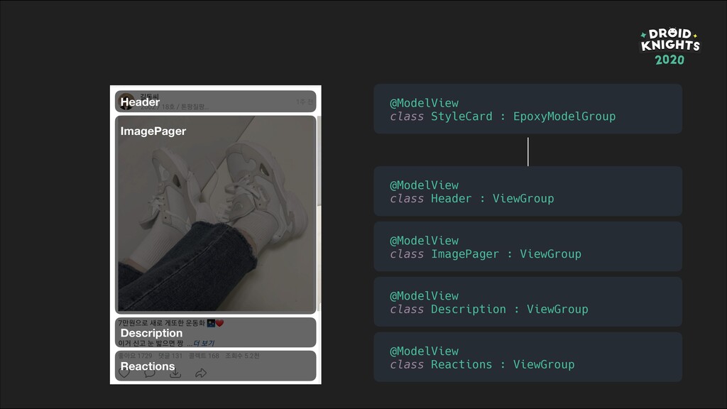 EpoxyModelGroup @ModelView class ImagePager : ViewGroup @ModelView class Description : ViewGroup @ModelView class Reactions : ViewGroup Header ImagePager Description Reactions
