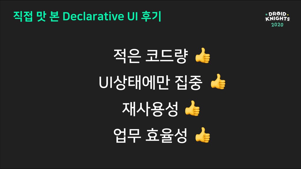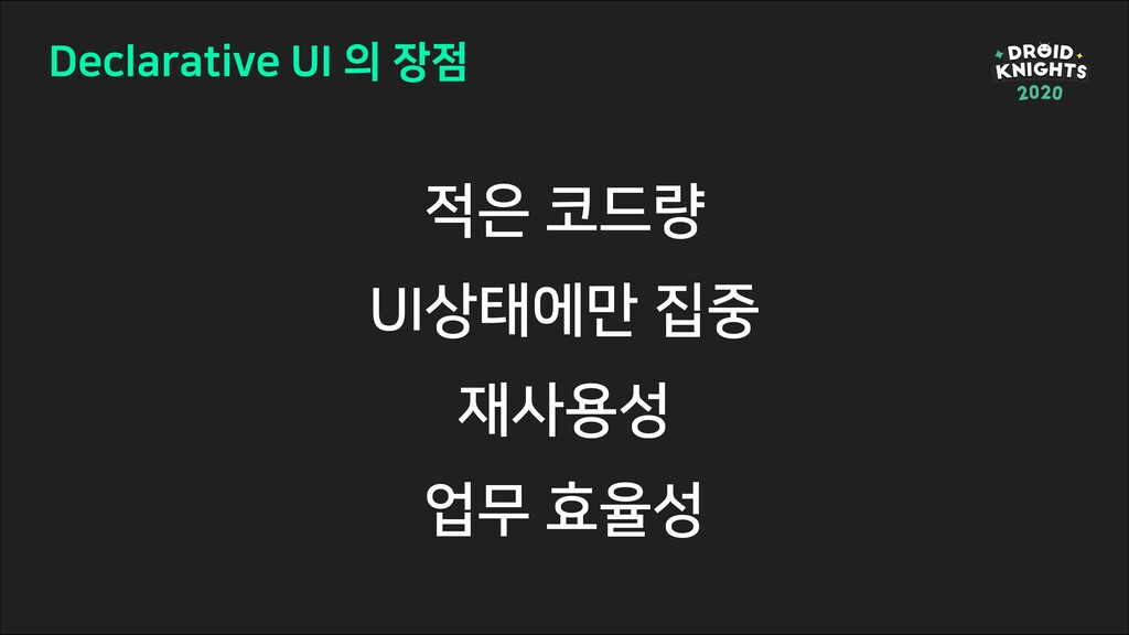 Declarative UI 의 장점 적은 코드량 UI상태에만 집중 재사용성 업무