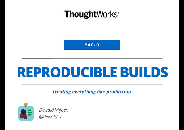 In this talk I'd like to take you through something I've been working on over the last couple of months: Containerising your build. The tool I'll be using for this is Docker, but it's achievable with any VM or container technology. I'll take you through going from a working build on local to building local inside a container and then to moving that build to a build server, explaining what how and why as I go.